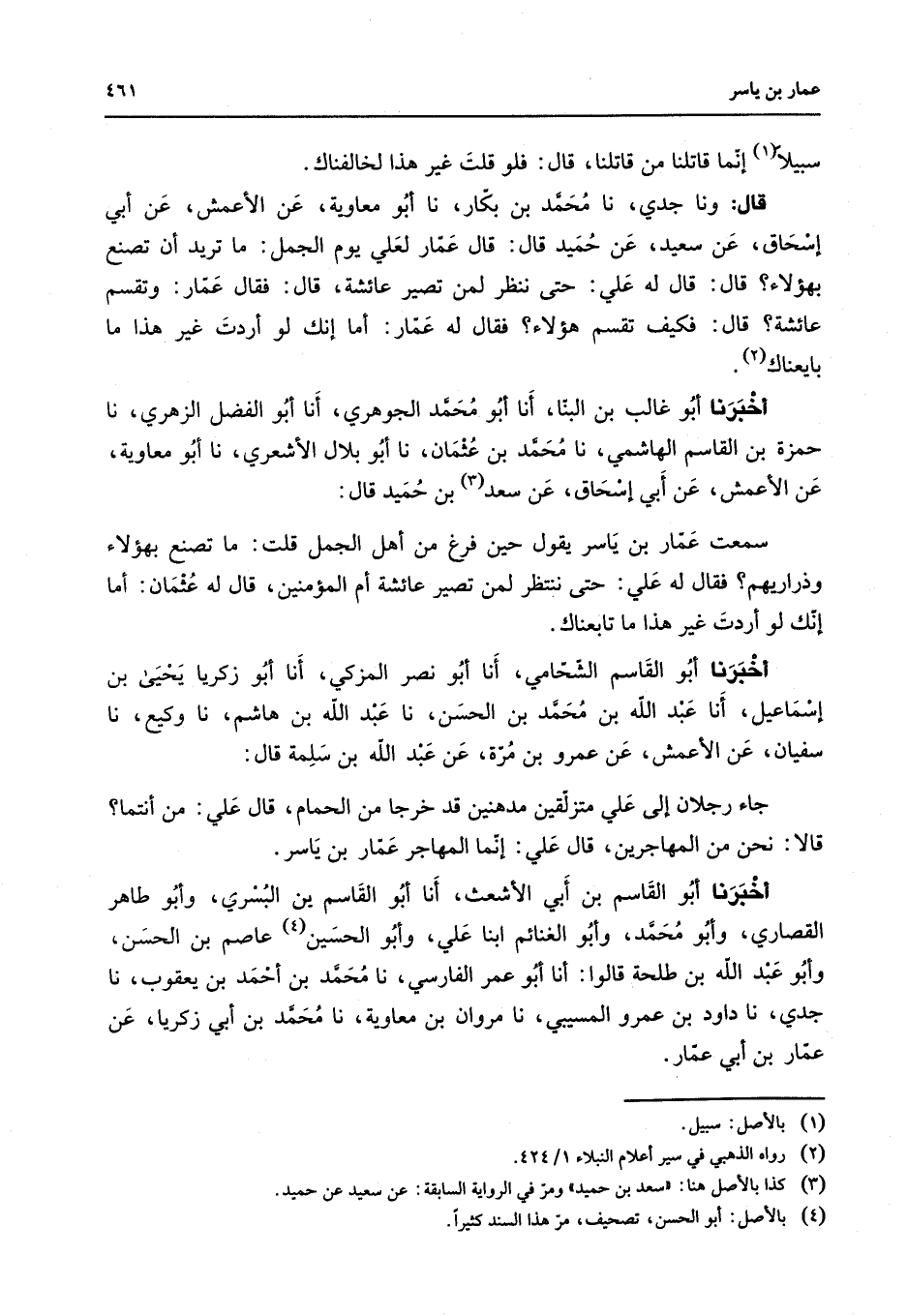 سبيلا (1) إنما قاتلنا من قاتلنا قال فلو قلت غير هذا لخالفناك قال ونا جدي نا محمد بن بكار نا أبو معاوية عن الأعمش عن أبي إسحاق عن سعيد عن حميد قال قال عمار لعلي يوم الجمل ما تريد أن تصنع بهؤلاء قال قال له علي حتى ننظر لمن تصير عائشة قال فقال عمار وتقسم عائشة قال فكيف تقسم هؤلاء فقال له عمار أما إنك لو أردت غير هذا ما بايعناك (2) أخبرنا أبو غالب بن البنا أنا أبو محمد الجوهري أنا أبو الفضل الزهري نا حمزة بن القاسم الهاشمي نا محمد بن عثمان نا أبو بلال الأشعري نا أبو معاوية عن الأعمش عن أبي إسحاق عن سعد (3) بن حميد قال سمعت عمار بن ياسر يقول حين فرغ من أهل الجمل قلت ما تصنع بهؤلاء وذراريهم فقال له علي حتى ننتظر لمن تصير عائشة أم المؤمنين قال له عثمان أما إنك لو أردت غير هذا ما تابعناك أخبرنا أبو القاسم الشحامي أنا أبو نصر المزكي أنا أبو زكريا يحيى بن إسماعيل أنا عبد الله بن محمد بن الحسن نا عبد الله بن هاشم نا وكيع نا سفيان عن الأعمش عن عمرو بن مرة عن عبد الله بن سلمة قال جاء رجلان إلى علي متزلقين مدهنين قد خرجا من الحمام قال علي من أنتما قالا نحن من المهاجرين قال علي إنما المهاجر عمار بن ياسر أخبرنا أبو القاسم بن أبي الأشعث أنا أبو القاسم بن البسري وأبو طاهر القصاري وأبو محمد وأبو الغنائم ابنا علي وأبو الحسين (4) عاصم بن الحسن وأبو عبد الله بن طلحة قالوا أنا أبو عمر الفارسي نا محمد بن أحمد بن يعقوب نا جدي نا داود بن عمرو المسيبي نا مروان بن معاوية نا محمد بن أبي زكريا عن عمار بن أبي عمار