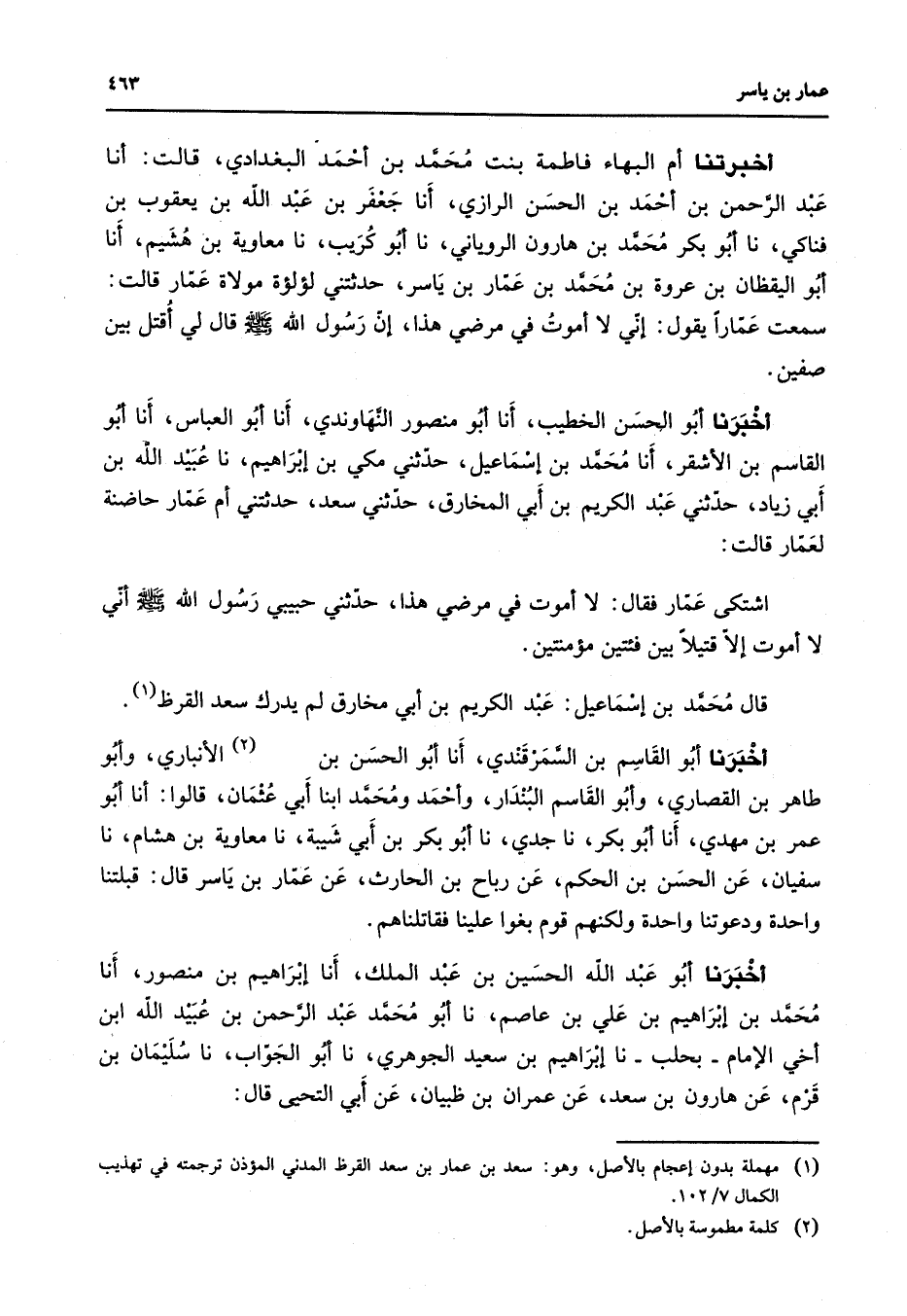 أخبرتنا أم البهاء فاطمة بنت محمد بن أحمد البغدادي قالت أنا عبد الرحمن بن أحمد بن الحسن الرازي أنا جعفر بن عبد الله بن يعقوب بن فناكي نا أبو بكر محمد بن هارون الروياني نا أبو كريب نا معاوية بن هشيم أنا أبو اليقظان بن عروة بن محمد بن عمار بن ياسر حدثتني لؤلؤة مولاة عمار قالت سمعت عمارا يقول إني لا أموت في مرضي هذا إن رسول الله (صلى الله عليه وسلم) قال لي أقتل بين صفين أخبرنا أبو الحسن الخطيب أنا أبو منصور النهاوندي أنا أبو العباس أنا أبو القاسم بن الأشقر أنا محمد بن إسماعيل حدثني مكي بن إبراهيم نا عبيد الله بن أبي زياد حدثني عبد الكريم بن أبي المخارق حدثني سعد حدثتني أم عمار حاضنة لعمار قالت اشتكى عمار فقال لا أموت في مرضي هذا حدثني حبيبي رسول الله (صلى الله عليه وسلم) أني لا أموت إلا قتيلا بين فئتين مؤمنتين قال محمد بن إسماعيل عبد الكريم بن أبي مخارق لم يدرك سعد القرظ (1) أخبرنا أبو القاسم بن السمرقندي أنا أبو الحسن بن (2) الأنباري وأبو طاهر بن القصاري وأبو القاسم البندار وأحمد ومحمد ابنا أبي عثمان قالوا أنا أبو عمر بن مهدي أنا أبو بكر نا جدي نا أبو بكر بن أبي شيبة نا معاوية بن هشام نا سفيان عن الحسن بن الحكم عن رباح بن الحارث عن عمار بن ياسر قال قبلتنا واحدة ودعوتنا واحدة ولكنهم قوم بغوا علينا فقاتلناهم أخبرنا أبو عبد الله الحسين بن عبد الملك أنا إبراهيم بن منصور أنا محمد بن إبراهيم بن علي بن عاصم نا أبو محمد عبد الرحمن بن عبيد الله ابن أخي الإمام بحلب نا إبراهيم بن سعيد الجوهري نا أبو الجواب نا سليمان بن قرم عن هارون بن سعد عن عمران بن ظبيان عن أبي التحيى قال