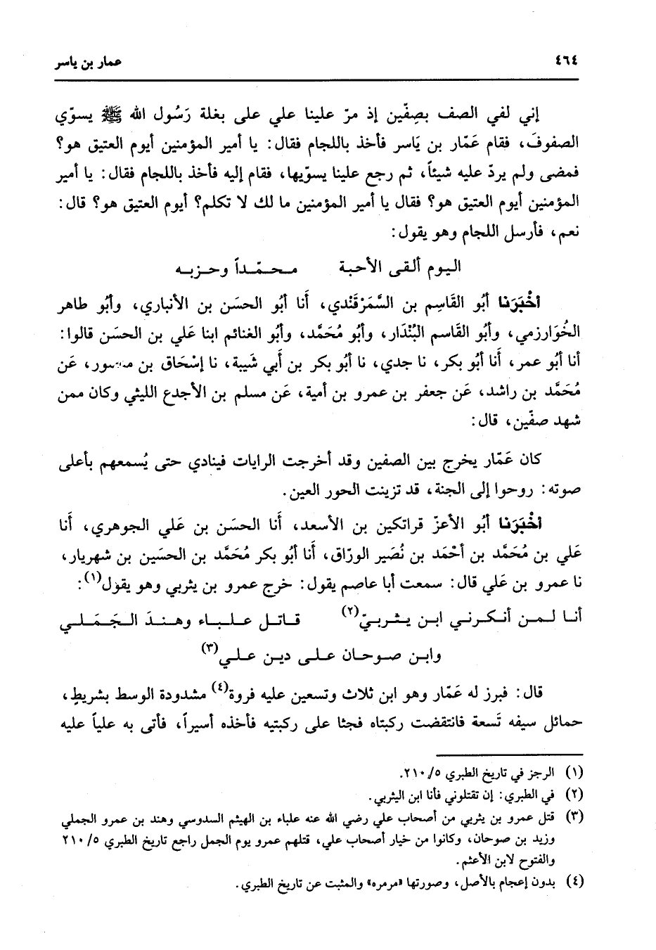 إني لفي الصف بصفين إذ مر علينا علي على بغلة رسول الله (صلى الله عليه وسلم) يسوي الصفوف فقام عمار بن ياسر فأخذ باللجام فقال يا أمير المؤمنين أيوم العتيق هو فمضى ولم يرد عليه شيئا ثم رجع علينا يسويها فقام إليه فأخذ باللجام فقال يا أمير المؤمنين أيوم العتيق هو فقال يا أمير المؤمنين ما لك لا تكلم أيوم العتيق هو قال نعم فأرسل اللجام وهو يقول * اليوم ألقى الأحبة * محمدا وحزبه * أخبرنا أبو القاسم بن السمرقندي أنا أبو الحسن بن الأنباري وأبو طاهر الخوارزمي وأبو القاسم البندار وأبو محمد وأبو الغنائم ابنا علي بن الحسن قالوا أنا أبو عمر أنا أبو بكر نا جدي نا أبو بكر بن أبي شيبة نا إسحاق بن منصور عن محمد بن راشد عن جعفر بن عمرو بن أمية عن مسلم بن الأجدع الليثي وكان ممن شهد صفين قال كان عمار يخرج بين الصفين وقد أخرجت الرايات فينادي حتى يسمعهم بأعلى صوته روحوا إلى الجنة قد تزينت الحور العين أخبرنا أبو الأعز قراتكين بن الأسعد أنا الحسن بن علي الجوهري أنا علي بن محمد بن أحمد بن نصير الوراق أنا أبو بكر محمد بن الحسين بن شهريار نا عمرو بن علي قال سمعت أبا عاصم يقول خرج عمرو بن يثربي وهو يقول (1) * أنا لمن أنكرني ابن يثربي (2) * قاتل علباء وهند الجملي وابن صوحان على دين علي (3) قال فبرز له عمار وهو ابن ثلاث وتسعين عليه فروة (4) مشدودة الوسط بشريط حمائل سيفه تسعة فانتقضت ركبتاه فجثا على ركبتيه فأخذه أسيرا فأتى به عليا عليه