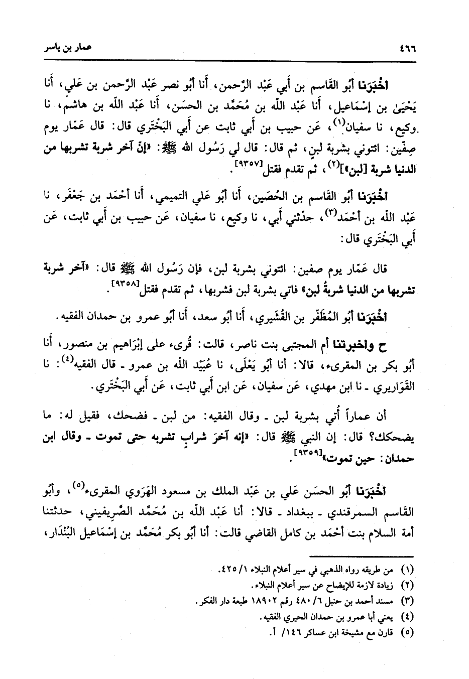 [9358] أخبرنا أبو المظفر بن القشيري أنا أبو سعد أنا أبو عمرو بن حمدان الفقيه ح وأخبرتنا أم المجتبى بنت ناصر قالت قرئ على إبراهيم بن منصور أنا أبو بكر بن المقرئ قالا أنا أبو يعلى نا عبيد الله بن عمرو قال الفقيه (4) نا القواريري نا ابن مهدي عن سفيان عن ابن أبي ثابت عن أبي البختري أن عمارا أتي بشربة لبن وقال الفقيه من لبن فضحك فقيل له ما يضحكك قال إن النبي (صلى الله عليه وسلم) قال إنه آخر شراب تشربه حتى تموت وقال ابن حمدان حين تموت