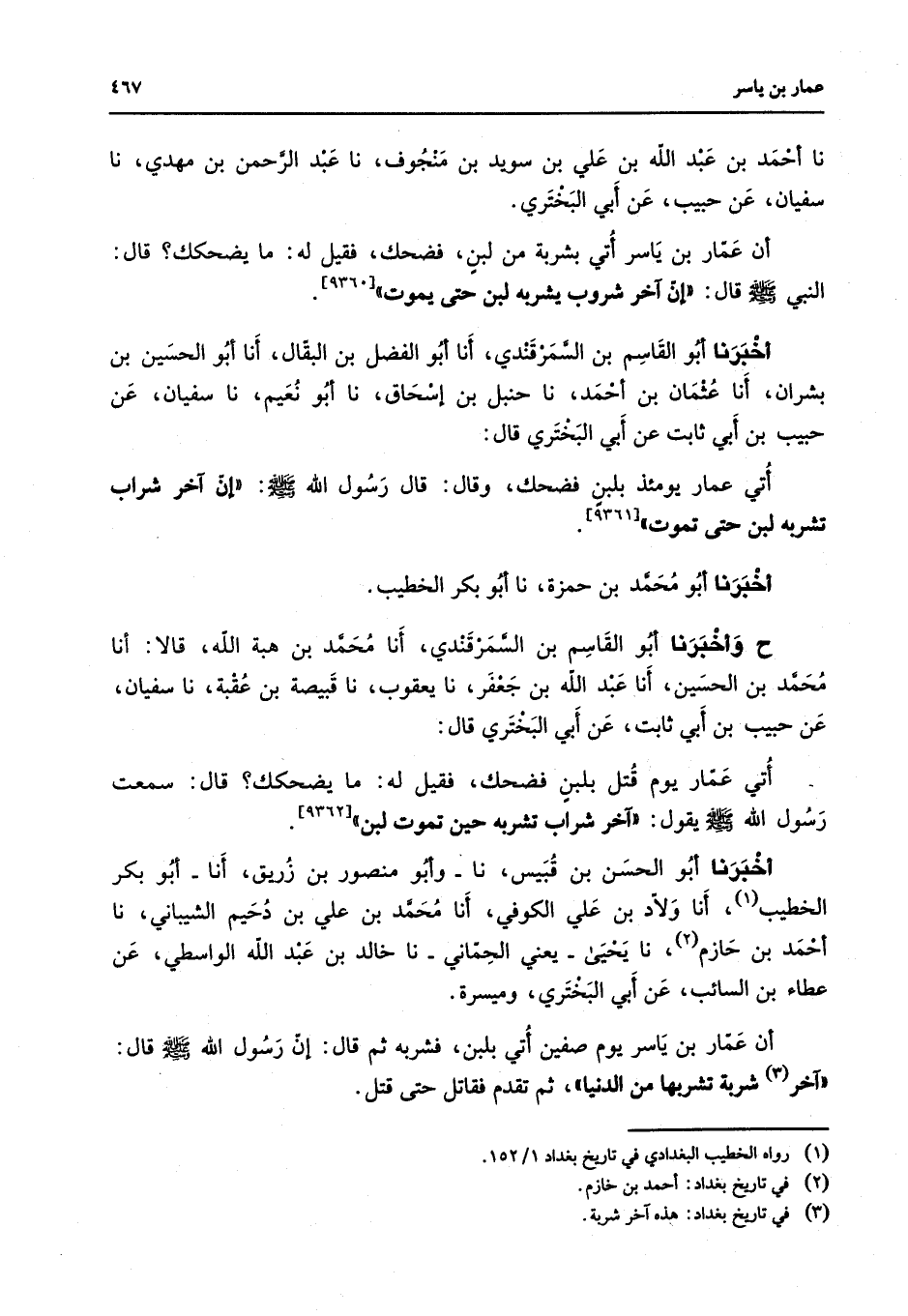 [9361] أخبرنا أبو محمد بن حمزة نا أبو بكر الخطيب ح وأخبرنا أبو القاسم بن السمرقندي أنا محمد بن هبة الله قالا أنا محمد بن الحسين أنا عبد الله بن جعفر نا يعقوب نا قبيصة بن عقبة نا سفيان عن حبيب بن أبي ثابت عن أبي البختري قال أتي عمار يوم قتل بلبن فضحك فقيل له ما يضحكك قال سمعت رسول الله (صلى الله عليه وسلم) يقول آخر شراب تشربه حين تموت لبن