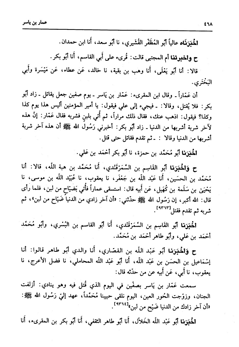 [9363] أخبرنا أبو القاسم بن السمرقندي أنا أبو القاسم بن البسري وأبو محمد أحمد بن علي وأبو طاهر أحمد بن محمد ح وأخبرنا أبو عبد الله بن القصاري أنا والدي أبو طاهر قالوا أنا إسماعيل بن الحسن بن عبد الله أنا أبو عبد الله المحاملي نا فضل الأعرج نا يعقوب نا أبي عن أبيه عن من حدثه قال سمعت عمار بن ياسر بصفين في اليوم الذي قتل فيه وهو ينادي أزلفت الجنان وزوجت الحور العين اليوم نلقى حبيبنا محمدا عهد إلي رسول الله (صلى الله عليه وسلم) أن آخر زادك من الدنيا ضيح من لبن
