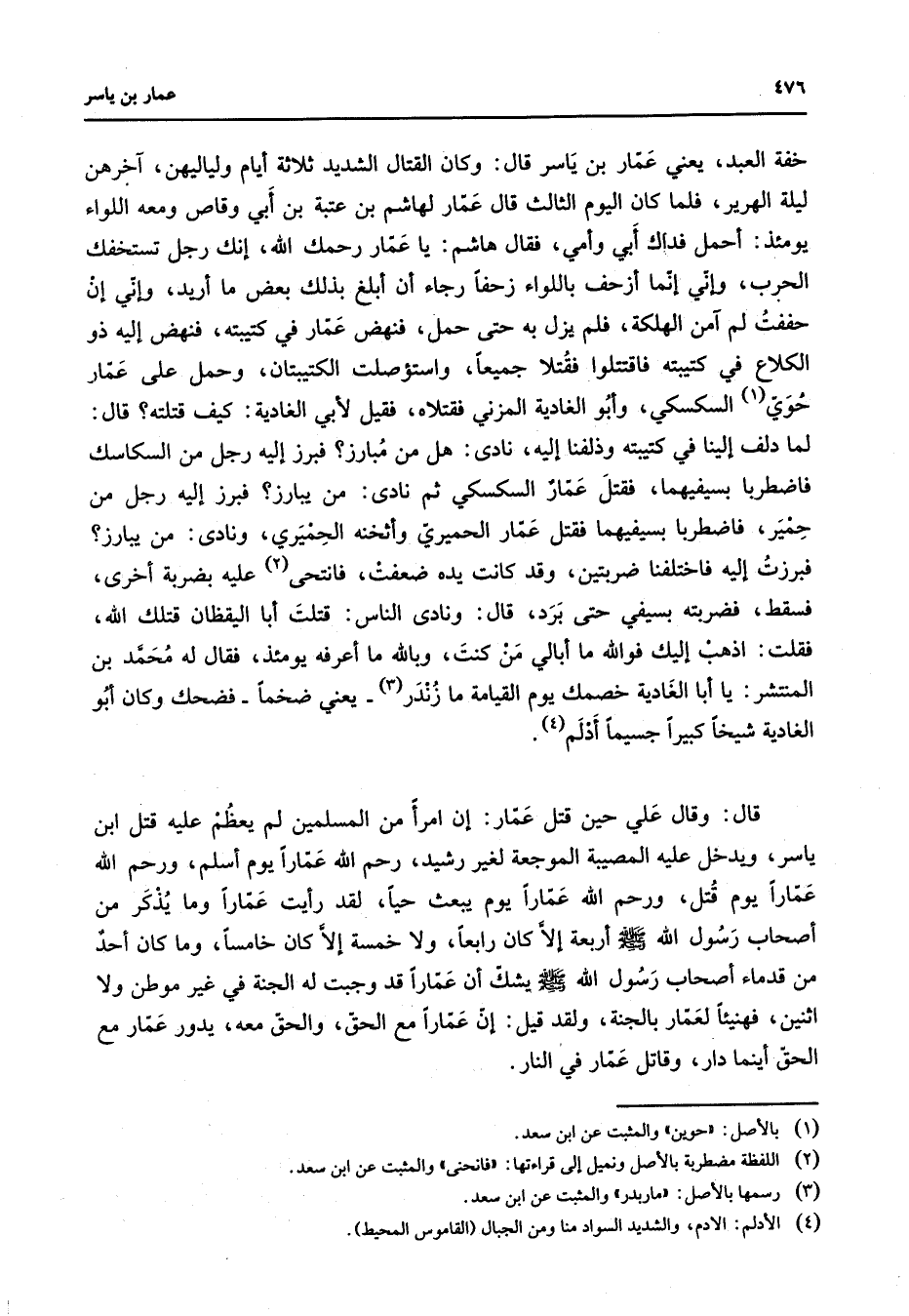 خفة العبد يعني عمار بن ياسر قال وكان القتال الشديد ثلاثة أيام ولياليهن آخرهن ليلة الهرير فلما كان اليوم الثالث قال عمار لهاشم بن عتبة بن أبي وقاص ومعه اللواء يومئذ أحمل فداك أبي وأمي فقال هاشم يا عمار رحمك الله إنك رجل تستخفك الحرب وإني إنما أزحف باللواء زحفا رجاء أن أبلغ بذلك بعض ما أريد وإني إن حففت لم آمن الهلكة فلم يزل به حتى حمل فنهض عمار في كتيبته فنهض إليه ذو الكلاع في كتيبته فاقتتلوا فقتلا جميعا واستؤصلت الكتيبتان وحمل على عمار حوي (1) السكسكي وأبو الغادية المزني فقتلاه فقيل لأبي الغادية كيف قتلته قال لما دلف إلينا في كتيبته وذلفنا إليه نادى هل من مبارز فبرز إليه رجل من السكاسك فاضطربا بسيفيهما فقتل عمار السكسكي ثم نادى من يبارز فبرز إليه رجل من حمير فاضطربا بسيفيهما فقتل عمار الحميري وأثخنه الحميري ونادى من يبارز فبرزت إليه فاختلفنا ضربتين وقد كانت يده ضعفت فانتحى (2) عليه بضربة أخرى فسقط فضربته بسيفي حتى برد قال ونادى الناس قتلت أبا اليقظان قتلك الله فقلت اذهب إليك فوالله ما أبالي من كنت وبالله ما أعرفه يومئذ فقال له محمد بن المنتشر يا أبا الغادية خصمك يوم القيامة ما زندر (3) يعني ضخما فضحك وكان أبو الغادية شيخا كبيرا جسيما أدلم (4) قال وقال علي حين قتل عمار إن امرأ من المسلمين لم يعظم عليه قتل ابن ياسر ويدخل عليه المصيبة الموجعة لغير رشيد رحم الله عمارا يوم أسلم ورحم الله عمارا يوم قتل ورحم الله عمارا يوم يبعث حيا لقد رأيت عمارا وما يذكر من أصحاب رسول الله (صلى الله عليه وسلم) أربعة إلا كان رابعا ولا خمسة إلا كان خامسا وما كان أحد من قدماء أصحاب رسول الله (صلى الله عليه وسلم) يشك أن عمارا قد وجبت له الجنة في غير موطن ولا اثنين فهنيئا لعمار بالجنة ولقد قيل إن عمارا مع الحق والحق معه يدور عمار مع الحق أينما دار وقاتل عمار في النار