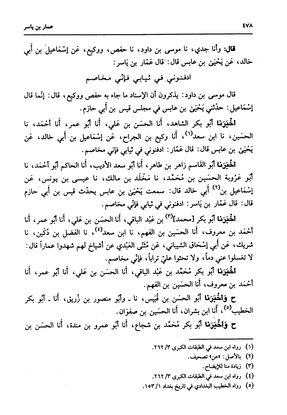 قال وأنا جدي نا موسى بن داود نا حفص ووكيع عن إسماعيل بن أبي خالد عن يحيى بن عابس قال قال عمار بن ياسر * ادفنوني في ثيابي فإني مخاصم قال موسى بن داود يذكرون أن الإسناد ما جاء به حفص ووكيع قال إنما قال إسماعيل حدثني يحيى بن عابس في مجلس قيس بن أبي حازم أخبرنا أبو بكر الشاهد أنا الحسن بن علي أنا أبو عمر أنا أحمد نا الحسين نا ابن سعد (1) أنا وكيع بن الجراح عن إسماعيل بن أبي خالد عن يحيى بن عابس قال قال عمار ادفنوني في ثيابي فإني مخاصم أخبرنا أبو القاسم زاهر بن طاهر أنا أبو سعد الأديب أنا الحاكم أبو أحمد نا أبو عروبة الحسين بن محمد نا مخلد بن مالك نا عيسى بن يونس عن إسماعيل بن (2) أبي خالد قال سمعت يحيى بن عابس يحدث قيس بن أبي حازم قال قال عمار بن ياسر ادفنوني في ثيابي فإني مخاصم أخبرنا أبو بكر محمد (3) بن عبد الباقي أنا الحسن بن علي أنا أبو عمر أنا أحمد بن معروف أنا الحسين بن الفهم نا ابن سعد (4) نا الفضل بن دكين نا شريك عن أبي إسحاق الشيباني عن مثنى العبدي عن أشياخ لهم شهدوا عمارا قال لا تغسلوا عني دما ولا تحثوا علي ترابا فإني مخاصم أخبرنا أبو بكر محمد بن عبد الباقي أنا الحسن بن علي أنا أبو عمر أنا أحمد بن معروف أنا الحسين بن الفهم ح وأخبرنا أبو الحسن بن قبيس نا وأبو منصور بن زريق أنا أبو بكر الخطيب (5) أنا ابن بشران أنا الحسين بن صفوان ح وأخبرنا أبو بكر محمد بن شجاع أنا أبو عمرو بن مندة أنا الحسن بن