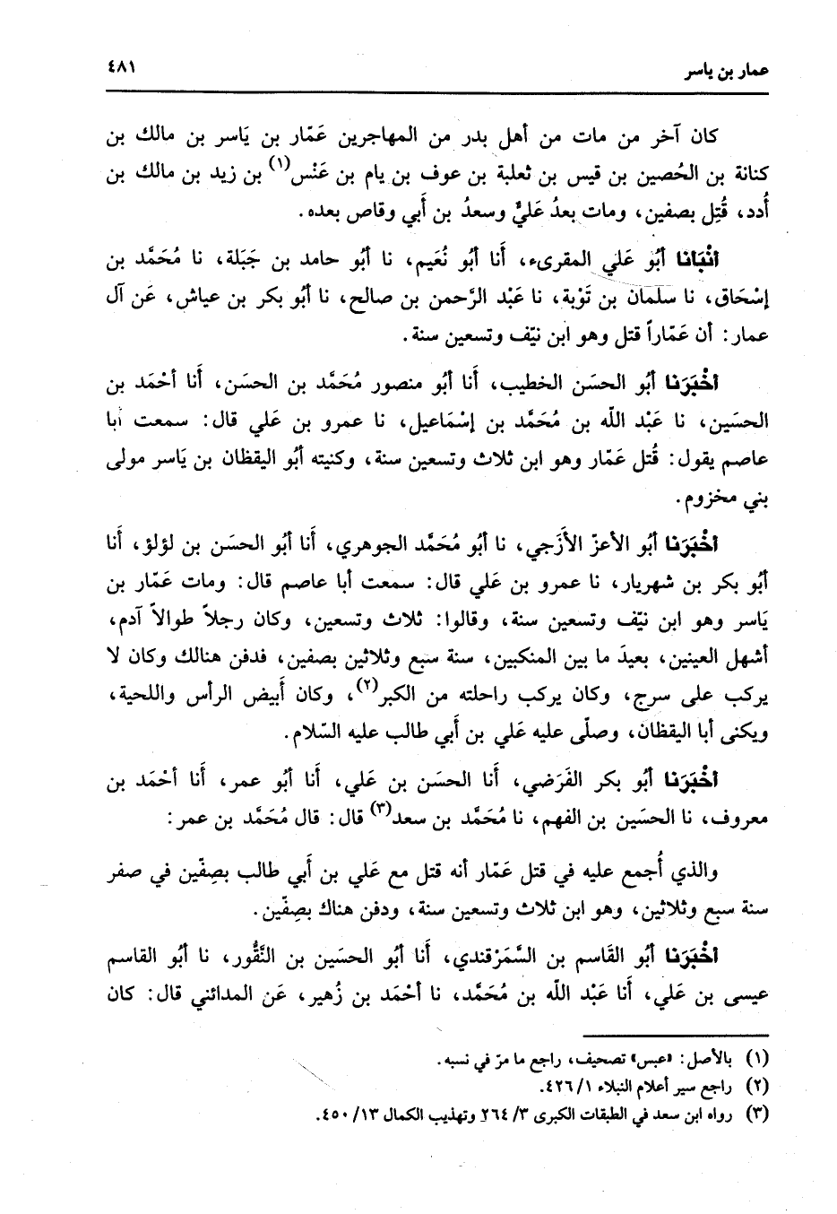 كان آخر من مات من أهل بدر من المهاجرين عمار بن ياسر بن مالك بن كنانة بن الحصين بن قيس بن ثعلبة بن عوف بن يام بن عنس (1) بن زيد بن مالك بن أدد قتل بصفين ومات بعد علي وسعد بن أبي وقاص بعده أنبأنا أبو علي المقرئ أنا أبو نعيم نا أبو حامد بن جبلة نا محمد بن إسحاق نا سلمان بن توبة نا عبد الرحمن بن صالح نا أبو بكر بن عياش عن آل عمار أن عمارا قتل وهو ابن نيف وتسعين سنة أخبرنا أبو الحسن الخطيب أنا أبو منصور محمد بن الحسن أنا أحمد بن الحسين نا عبد الله بن محمد بن إسماعيل نا عمرو بن علي قال سمعت أبا عاصم يقول قتل عمار وهو ابن ثلاث وتسعين سنة وكنيته أبو اليقظان بن ياسر مولى بني مخزوم أخبرنا أبو الأعز الأزجي نا أبو محمد الجوهري أنا أبو الحسن بن لؤلؤ أنا أبو بكر بن شهريار نا عمرو بن علي قال سمعت أبا عاصم قال ومات عمار بن ياسر وهو ابن نيف وتسعين سنة وقالوا ثلاث وتسعين وكان رجلا طوالا آدم أشهل العينين بعيد ما بين المنكبين سنة سبع وثلاثين بصفين فدفن هنالك وكان لا يركب على سرج وكان يركب راحلته من الكبر (2) وكان أبيض الرأس واللحية ويكنى أبا اليقظان وصلى عليه علي بن أبي طالب عليه السلام أخبرنا أبو بكر الفرضي أنا الحسن بن علي أنا أبو عمر أنا أحمد بن معروف نا الحسين بن الفهم نا محمد بن سعد (3) قال قال محمد بن عمر والذي أجمع عليه في قتل عمار أنه قتل مع علي بن أبي طالب بصفين في صفر سنة سبع وثلاثين وهو ابن ثلاث وتسعين سنة ودفن هناك بصفين أخبرنا أبو القاسم بن السمرقندي أنا أبو الحسين بن النقور نا أبو القاسم عيسى بن علي أنا عبد الله بن محمد نا أحمد بن زهير عن المدائني قال كان