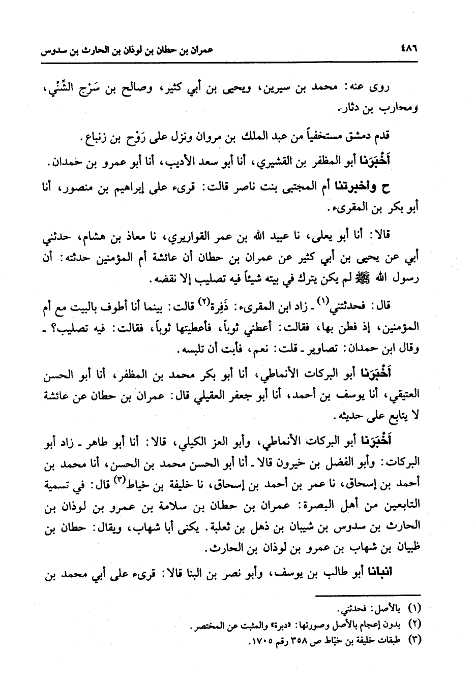 روى عنه محمد بن سيرين ويحيى بن أبي كثير وصالح بن سرج الشني ومحارب بن دثار قدم دمشق مستخفيا من عبد الملك بن مروان ونزل على روح بن زنباع أخبرنا أبو المظفر بن القشيري أنا أبو سعد الأديب أنا أبو عمرو بن حمدان ح وأخبرتنا أم المجتبى بنت ناصر قالت قرئ على إبراهيم بن منصور أنا أبو بكر بن المقرئ قالا أنا أبو يعلى نا عبيد الله بن عمر القواريري نا معاذ بن هشام حدثني أبي عن يحيى بن أبي كثير عن عمران بن حطان أن عائشة أم المؤمنين حدثته أن رسول الله (صلى الله عليه وسلم) لم يكن يترك في بيته شيئا فيه تصليب إلا نقضه قال فحدثتني (1) زاد ابن المقرئ ذفرة (2) قالت بينما أنا أطوف بالبيت مع أم المؤمنين إذ فطن بها فقالت أعطني ثوبا فأعطيتها ثوبا فقالت فيه تصليب وقال ابن حمدان تصاوير قلت نعم فأبت أن تلبسه أخبرنا أبو البركات الأنماطي أنا أبو بكر محمد بن المظفر أنا أبو الحسن العتيقي أنا يوسف بن أحمد أنا أبو جعفر العقيلي قال عمران بن حطان عن عائشة لا يتابع على حديثه أخبرنا أبو البركات الأنماطي وأبو العز الكيلي قالا أنا أبو طاهر زاد أبو البركات وأبو الفضل بن خيرون قالا أنا أبو الحسن محمد بن الحسن أنا محمد بن أحمد بن إسحاق نا عمر بن أحمد بن إسحاق نا خليفة بن خياط (3) قال في تسمية التابعين من أهل البصرة عمران بن حطان بن سلامة بن عمرو بن لوذان بن الحارث بن سدوس بن شيبان بن ذهل بن ثعلبة يكنى أبا شهاب ويقال حطان بن ظبيان بن شهاب بن عمرو بن لوذان بن الحارث أنبأنا أبو طالب بن يوسف وأبو نصر بن البنا قالا قرئ على أبي محمد بن