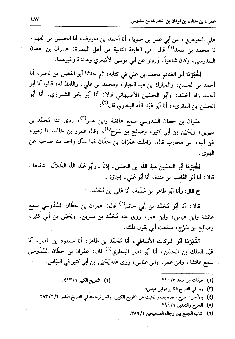 علي الجوهري عن أبي عمر بن حيوية أنا أحمد بن معروف أنا الحسين بن الفهم نا محمد بن سعد (1) قال في الطبقة الثانية من أهل البصرة عمران بن حطان السدوسي وكان شاعرا وروى عن أبي موسى الأشعري وعائشة وغيرهما أخبرنا أبو الغنائم محمد بن علي في كتابه ثم حدثنا أبو الفضل بن ناصر أنا أحمد بن الحسن والمبارك بن عبد الجبار ومحمد بن علي واللفظ له قالوا أنا أبو أحمد زاد أحمد وأبو الحسين الأصبهاني قالا أنا أبو بكر الشيرازي أنا أبو الحسن بن المقرئ أنا أبو عبد الله البخاري قال (2) عمران بن حطان السدوسي سمع عائشة وابن عمر (3) روى عنه محمد بن سيرين ويحيى بن أبي كثير وصالح بن سرج (4) وقال عمرو بن خالد نا زهير عن أبيه عن محارب قال زاملت عمران بن حطان فما سأل واحد منا صاحبه عن الهوى أخبرنا أبو الحسين هبة الله بن الحسن إذنا وأبو عبد الله الخلال شفاها قالا أنا أبو القاسم بن مندة أنا أبو علي إجازة ح قال وأنا أبو طاهر بن سلمة أنا علي بن محمد قالا أنا أبو محمد بن أبي حاتم (5) قال عمران بن حطان السدوسي سمع عائشة وابن عباس وابن عمر روى عنه محمد بن سيرين ويحيى بن أبي كثير وصالح بن سرج سمعت أبي يقول ذلك أخبرنا أبو البركات الأنماطي أنا محمد بن طاهر أنا مسعود بن ناصر أنا عبد الملك بن الحسن أنا أبو نصر البخاري (6) قال عمران بن حطان السدوسي سمع عائشة وابن عمر وابن عباس روى عنه يحيى بن أبي كثير في اللباس