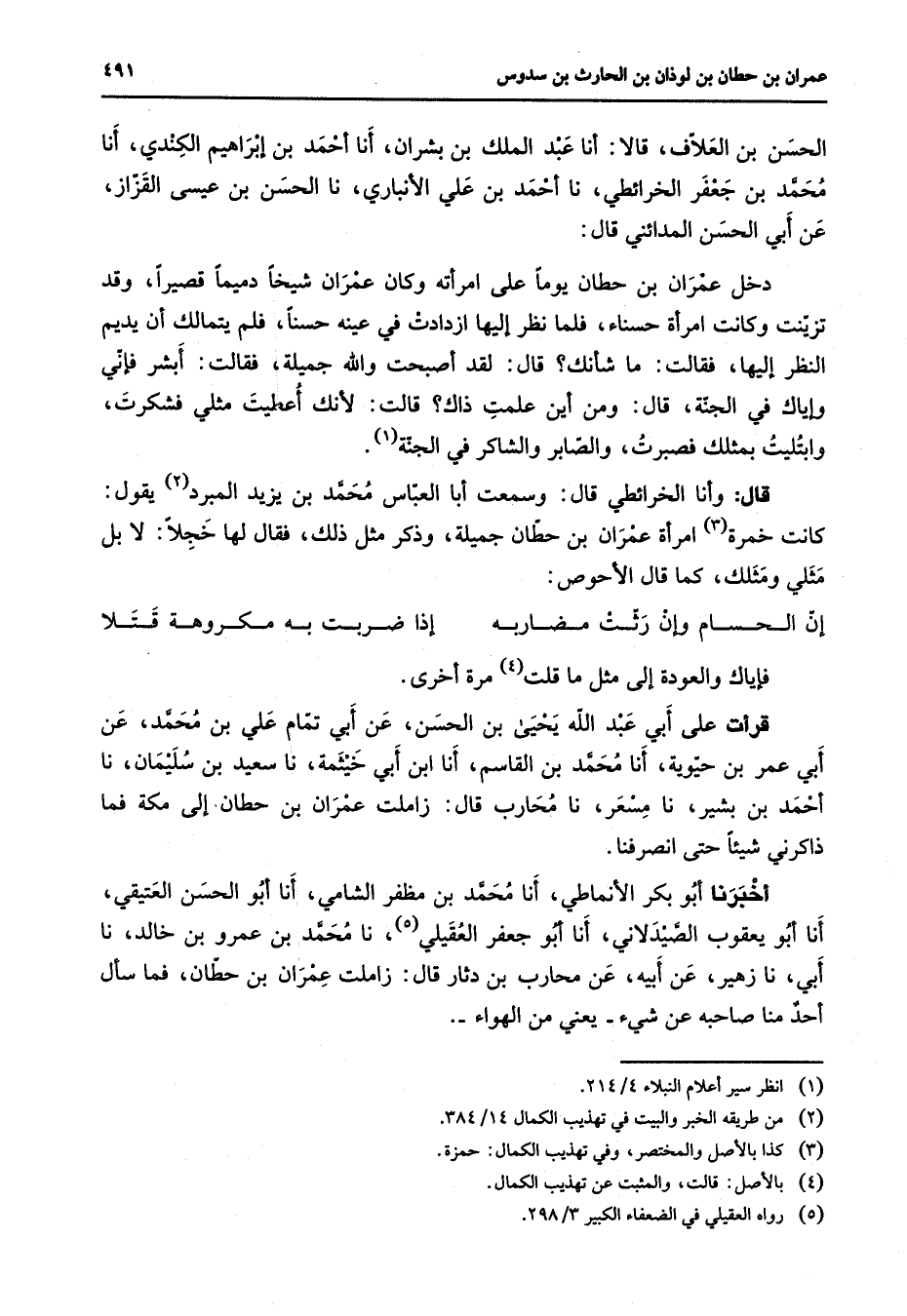 الحسن بن العلاف قالا أنا عبد الملك بن بشران أنا أحمد بن إبراهيم الكندي أنا محمد بن جعفر الخرائطي نا أحمد بن علي الأنباري نا الحسن بن عيسى القزاز عن أبي الحسن المدائني قال دخل عمران بن حطان يوما على امرأته وكان عمران شيخا دميما قصيرا وقد تزينت وكانت امرأة حسناء فلما نظر إليها ازدادت في عينه حسنا فلم يتمالك أن يديم النظر إليها فقالت ما شأنك قال لقد أصبحت والله جميلة فقالت أبشر فإني وإياك في الجنة قال ومن أين علمت ذاك قالت لأنك أعطيت مثلي فشكرت وابتليت بمثلك فصبرت والصابر والشاكر في الجنة (1) قال وأنا الخرائطي قال وسمعت أبا العباس محمد بن يزيد المبرد (2) يقول كانت خمرة (3) امرأة عمران بن حطان جميلة وذكر مثل ذلك فقال لها خجلا لا بل مثلي ومثلك كما قال الأحوص * إن الحسام وإن رثت مضاربه * إذا ضربت به مكروهة قتلا * فإياك والعودة إلى مثل ما قلت (4) مرة أخرى قرأت على أبي عبد الله يحيى بن الحسن عن أبي تمام علي بن محمد عن أبي عمر بن حيوية أنا محمد بن القاسم أنا ابن أبي خيثمة نا سعيد بن سليمان نا أحمد بن بشير نا مسعر نا محارب قال زاملت عمران بن حطان إلى مكة فما ذاكرني شيئا حتى انصرفنا أخبرنا أبو بكر الأنماطي أنا محمد بن مظفر الشامي أنا أبو الحسن العتيقي أنا أبو يعقوب الصيدلاني أنا أبو جعفر العقيلي (5) نا محمد بن عمرو بن خالد نا أبي نا زهير عن أبيه عن محارب بن دثار قال زاملت عمران بن حطان فما سأل أحد منا صاحبه عن شئ يعني من الهواء