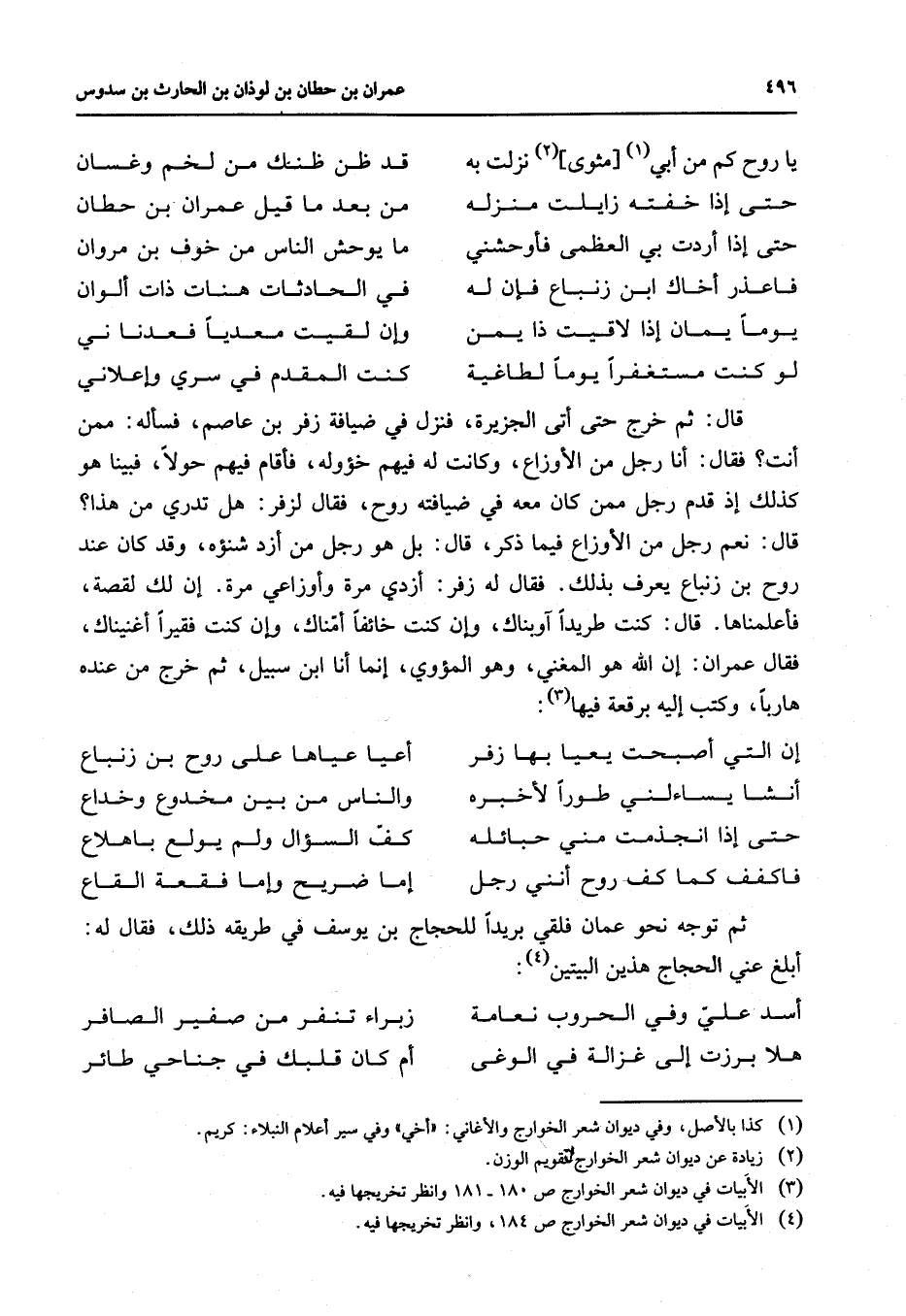 * يا روح كم من أبي (1) مثوى (2) نزلت به * قد ظن ظنك من لخم وغسان حتى إذا خفته زايلت منزله * من بعد ما قيل عمران بن حطان حتى إذا أردت بي العظمى فأوحشني * ما يوحش الناس من خوف بن مروان * * فاعذر أخاك ابن زنباع فإن له * في الحادثات هنات ذات ألوان يوما يمان إذا لاقيت ذا يمن * وإن لقيت معديا فعدنا ني لو كنت مستغفرا يوما لطاغية * كنت المقدم في سري وإعلاني * قال ثم خرج حتى أتى الجزيرة فنزل في ضيافة زفر بن عاصم فسأله ممن أنت فقال أنا رجل من الأوزاع وكانت له فيهم خؤوله فأقام فيهم حولا فبينا هو كذلك إذ قدم رجل ممن كان معه في ضيافته روح فقال لزفر هل تدري من هذا قال نعم رجل من الأوزاع فيما ذكر قال بل هو رجل من أزد شنؤه وقد كان عند روح بن زنباع يعرف بذلك فقال له زفر أزدي مرة وأوزاعي مرة إن لك لقصة فأعلمناها قال كنت طريدا آوبناك وإن كنت خائفا أمناك وإن كنت فقيرا أغنيناك فقال عمران إن الله هو المغني وهو المؤوي إنما أنا ابن سبيل ثم خرج من عنده هاربا وكتب إليه برقعة فيها (3) * إن التي أصبحت يعيا بها زفر * أعيا عياها على روح بن زنباع أنشا يساءلني طورا لأخبره * والناس من بين مخدوع وخداع حتى إذا انجذمت مني حبائله * كف السؤال لم يولع باهلاع فاكفف كما كف روح أنني رجل * إما ضريح وإما فقعة القاع * ثم توجه نحو عمان فلقي بريدا للحجاج بن يوسف في طريقه ذلك فقال له أبلغ عني الحجاج هذين البيتين (4) * أسد علي وفي الحروب نعامة * زبراء تنفر من صفير الصافر هلا برزت إلى غزالة في الوغى * أم كان قلبك في جناحي طائر