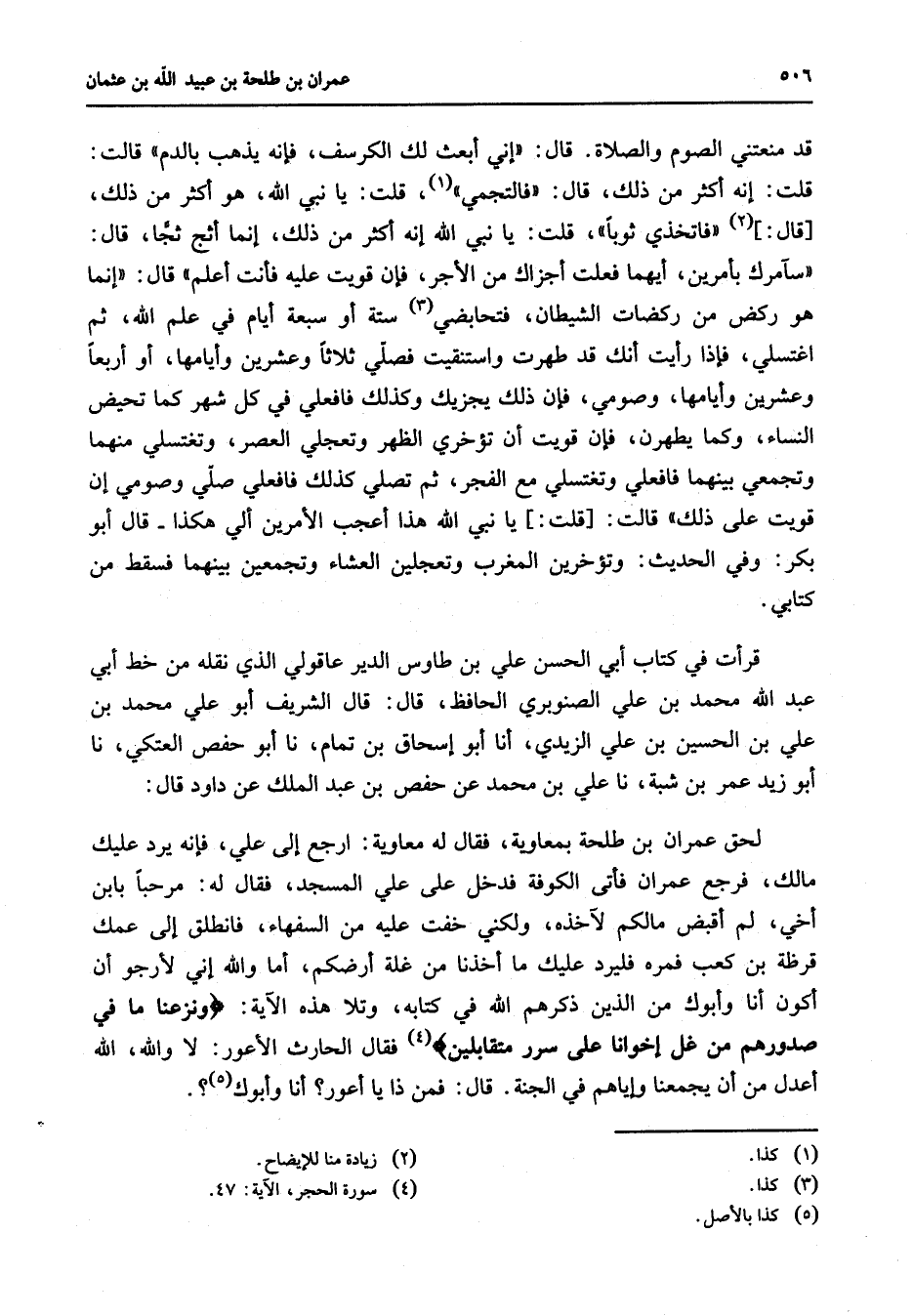 قد منعتني الصوم والصلاة قال إني أبعث لك الكرسف فإنه يذهب بالدم قالت قلت إنه أكثر من ذلك قال فالتجمي (1) قلت يا نبي الله هو أكثر من ذلك قال (2) فاتخذي ثوبا قلت يا نبي الله إنه أكثر من ذلك إنما أثج ثجا قال سآمرك بأمرين أيهما فعلت أجزاك من الأجر فإن قويت عليه فأنت أعلم قال إنما هو ركض من ركضات الشيطان فتحابضي (3) ستة أو سبعة أيام في علم الله ثم اغتسلي فإذا رأيت أنك قد طهرت واستنقيت فصلي ثلاثا وعشرين وأيامها أو أربعا وعشرين وأيامها وصومي فإن ذلك يجزيك وكذلك فافعلي في كل شهر كما تحيض النساء وكما يطهرن فإن قويت أن تؤخري الظهر وتعجلي العصر وتغتسلي منهما وتجمعي بينهما فافعلي وتغتسلي مع الفجر ثم تصلي كذلك فافعلي صلي وصومي إن قويت على ذلك قالت قلت يا نبي الله هذا أعجب الأمرين ألي هكذا قال أبو بكر وفي الحديث وتؤخرين المغرب وتعجلين العشاء وتجمعين بينهما فسقط من كتابي قرأت في كتابي أبي الحسن علي بن طاوس الدير عاقولي الذي نقله من خط أبي عبد الله محمد بن علي الصنوبري الحافظ قال قال الشريف أبو علي محمد بن علي بن الحسين بن علي الزيدي أنا أبو إسحاق بن تمام نا أبو حفص العتكي نا أبو زيد عمر بن شبة نا علي بن محمد عن حفص بن عبد الملك عن داود قال لحق عمران بن طلحة بمعاوية فقال له معاوية ارجع إلى علي فإنه يرد عليك مالك فرجع عمران فأتى الكوفة فدخل على علي المسجد فقال له مرحبا بابن أخي لم أقبض مالك لآخذه ولكني خفت عليه من السفهاء فانطلق إلى عمك قرظة بن كعب فمره فليرد عليك ما أخذنا من غلة أرضكم أنا والله إني لأرجو أن أكون أنا وأبوك من الذين ذكرهم الله في كتابه وتلا هذه الآية " ونزعنا ما في صدورهم من غل إخوانا على سرر متقابلين " (4) فقال الحارث الأعور لا والله الله أعدل من أن يجمعنا وإياهم في الجنة قال فمن ذا يا أعور أنا وأبوك (5)