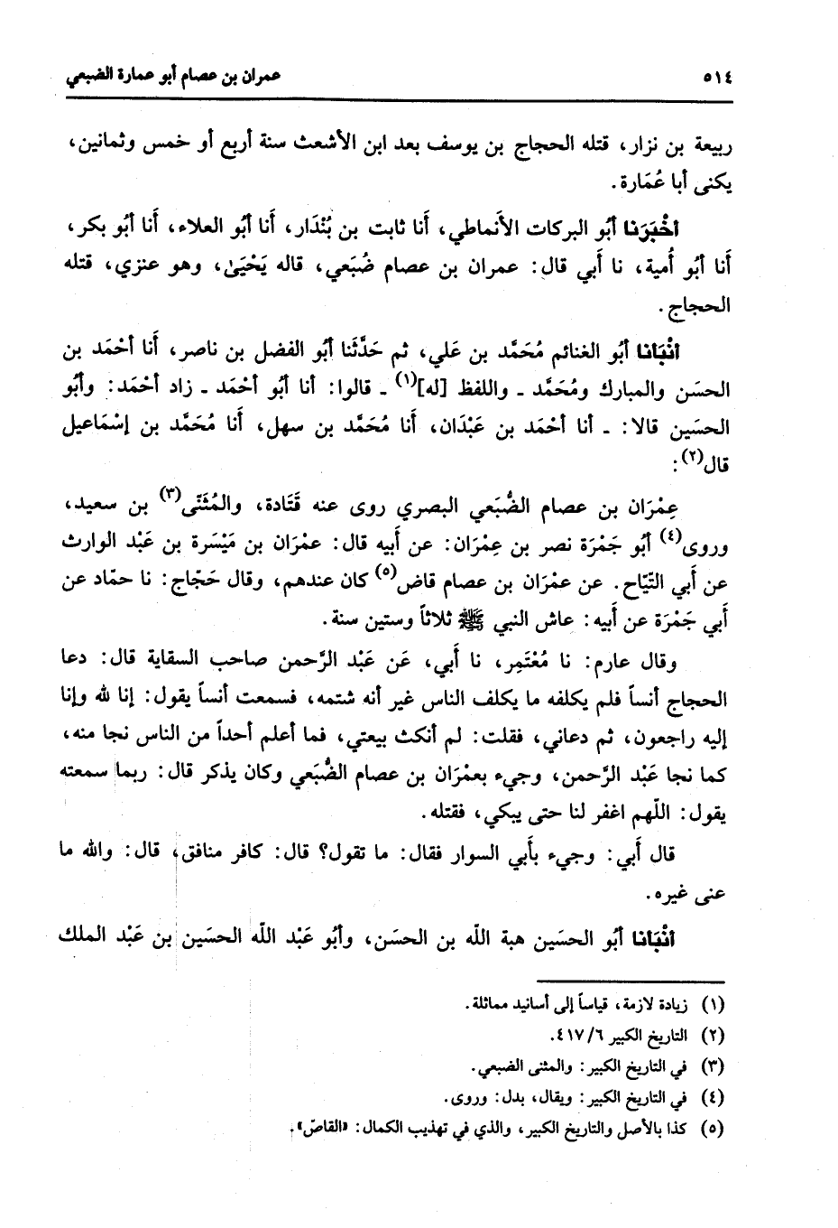 ربيعة بن نزار قتله الحجاج بن يوسف بعد ابن الأشعث سنة أربع أو خمس وثمانين يكنى أبا عمارة أخبرنا أبو البركات الأنماطي أنا ثابت بن بندار أنا أبو العلاء أنا أبو بكر أنا أبو أمية نا أبي قال عمران بن عصام ضبعي قاله يحيى وهو عنزي قتله الحجاج أنبأنا أبو الغنائم محمد بن علي ثم حدثنا أبو الفضل بن ناصر أنا أحمد بن الحسن والمبارك ومحمد واللفظ له (1) قالوا أنا أبو أحمد زاد أحمد وأبو الحسين قالا أنا أحمد بن عبدان أنا محمد بن سهل أنا محمد بن إسماعيل قال (2) عمران بن عصام الضبعي البصري روى عنه قتادة والمثنى (3) بن سعيد وروى (4) أبو جمرة نصر بن عمران عن أبيه قال عمران بن ميسرة بن عبد الوارث عن أبي التياح عن عمران بن عصام قاض (5) كان عندهم وقال حجاج نا حماد عن أبي جمرة عن أبيه عاش النبي (صلى الله عليه وسلم) ثلاثا وستين سنة وقال عارم نا معتمر نا أبي عن عبد الرحمن صاحب السقاية قال دعا الحجاج أنسا فلم يكلفه ما يكلف الناس غير أنه شتمه فسمعت أنسا يقول إنا لله وإنا إليه راجعون ثم دعاني فقلت لم أنكث بيعتي فما أعلم أحدا من الناس نجا منه كما نجا عبد الرحمن وجئ بعمران بن عصام الضبعي وكان يذكر قال ربما سمعته يقول اللهم اغفر لنا حتى يبكي فقتله قال أبي وجئ بأبي السوار فقال ما تقول قال كافر منافق قال والله ما عنى غيره أنبأنا أبو الحسين هبة الله بن الحسن وأبو عبد الله الحسين بن عبد الملك