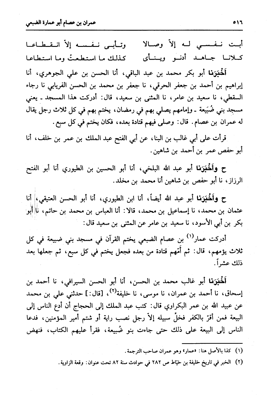 أبت نفسي له إلا وصالا * وتأبى نفسه إلا انقطاعا كلانا جاهد أدنو وينأى * كذلك ما استطعت وما استطاعا * أخبرنا أبو بكر محمد بن عبد الباقي أنا الحسن بن علي الجوهري أنا إبراهيم بن أحمد بن جعفر الحرقي نا جعفر بن محمد بن الحسن الفريابي نا رجاء السقطي نا سعيد بن عامر نا المثنى بن سعيد قال أدركت هذا المسجد يعني مسجد بني ضبيعة وإمامهم يصلي بهم في رمضان يختم بهم في كل ثلاث رجل يقال له عمران بن عصام قال وصلى فيهم قتادة بعده فكان يختم في كل سبع قرأت على أبي غالب بن البنا عن أبي الفتح عبد الملك بن عمر بن خلف أنا أبو حفص عمر بن أحمد بن شاهين ح وأخبرنا أبو عبد الله البلخي أنا أبو الحسين بن الطيوري أنا أبو الفتح الرزاز نا أبو حفص بن شاهين أنا محمد بن مخلد ح وأخبرنا أبو عبد الله أيضا أنا ابن الطيوري أنا أبو الحسن العتيقي أنا عثمان بن محمد نا إسماعيل بن محمد قالا أنا العباس بن محمد بن حاتم نا أبو بكر بن أبي الأسود نا سعيد بن عامر عن المثنى بن سعيد قال أدركت عمار (1) بن عصام الضبعي يختم القرآن في مسجد بني ضبيعة في كل ثلاث يؤمهم قال ثم أمهم قتادة من بعده فجعل يختم في كل سبع ثم جعلها بعد ذلك عشرا أخبرنا أبو غالب محمد بن الحسن أنا أبو الحسن السيرافي نا أحمد بن إسحاق نا أحمد بن عمران نا موسى نا خليفة (2) قال حدثني علي بن محمد عن عبيد الله بن عمر البكراوي قال كتب عبد الملك إلى الحجاج أن أدع الناس إلى البيعة فمن أقر بالكفر فخل سبيله إلا رجل نصب راية أو شتم أمير المؤمنين فدعا الناس إلى البيعة على ذلك حتى جاءت بنو ضبيعة فقرأ عليهم الكتاب فنهض