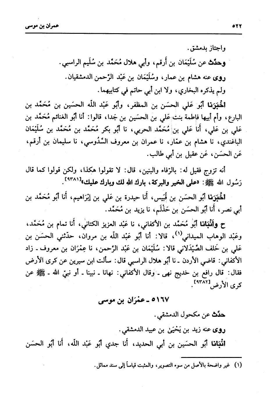 5167 - عمران بن موسى حدث عن مكحول الدمشقي روى عنه زيد بن يحيى بن عبيد الدمشقي أنبأنا أبو الحسين بن أبي الحديد أنا جدي أبو عبد الله أنا أبو الحسن
