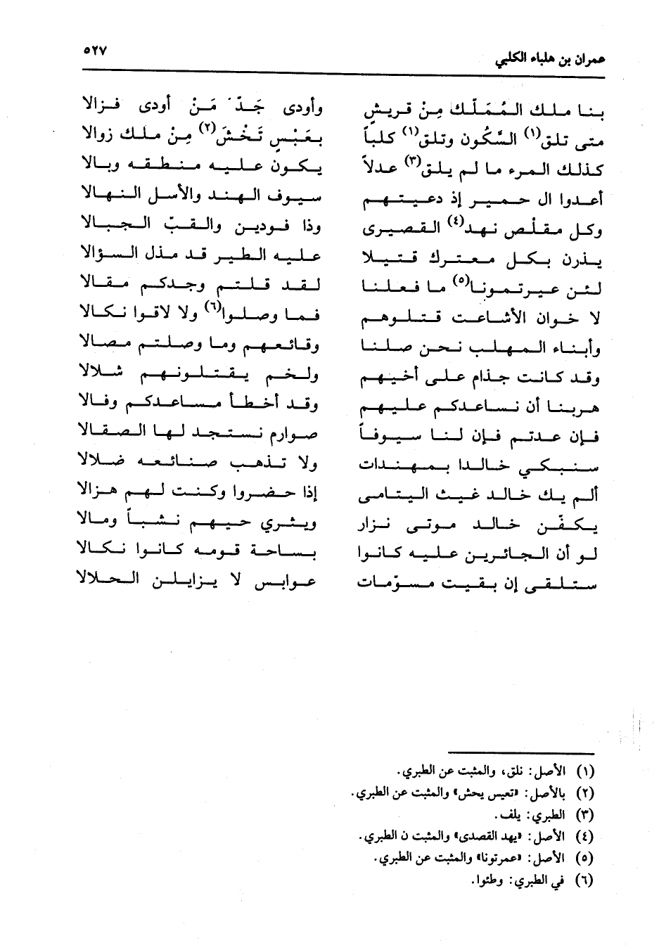 بنا ملك المملك من قريش * وأودى جد من أودى فزالا متى تلق (1) السكون وتلق (1) كلبا * بعبس تخش (2) من ملك زوالا كذلك المرء ما لم يلق (3) عدلا * يكون عليه منطقه وبالا أعدوا آل حمير إذ دعيتهم * سيوف الهند والأسل النهالا وكل مقلص نهد (4) القصيري * وذا فودين والقب الجبالا يذرن بكل معترك قتيلا * عليه الطير قد مذل السؤالا * * لئن عيرتمونا (5) ما فعلنا * لقد قلتم وجدكم مقالا لا خوان الأشاعت قتلوهم * فما وصلوا (6) ولا لاقوا نكالا وأبناء المهلب نحن صلنا * وقائعهم وما وصلتم مصالا وقد كانت جذام على أخيهم * ولخم يقتلونهم شلالا هربنا أن نساعدكم عليهم * وقد أخطأ مساعدكم وفالا فإن عدتم فإن لنا سيوفا * صوارم نستجد لها الصقالا سنبكي خالدا بمهندات * ولا تذهب صنائعه ضلالا ألم يك خالد غيث اليتامى * إذا حضروا وكنت لهم هزالا يكفن خالد موتى نزار * ويثري حيهم نشبا ومالا لو أن الجائرين عليه كانوا * بساحة قومه كانوا نكالا ستلقى إن بقيت مسومات * عوابس لا يزايلن الحلالا *