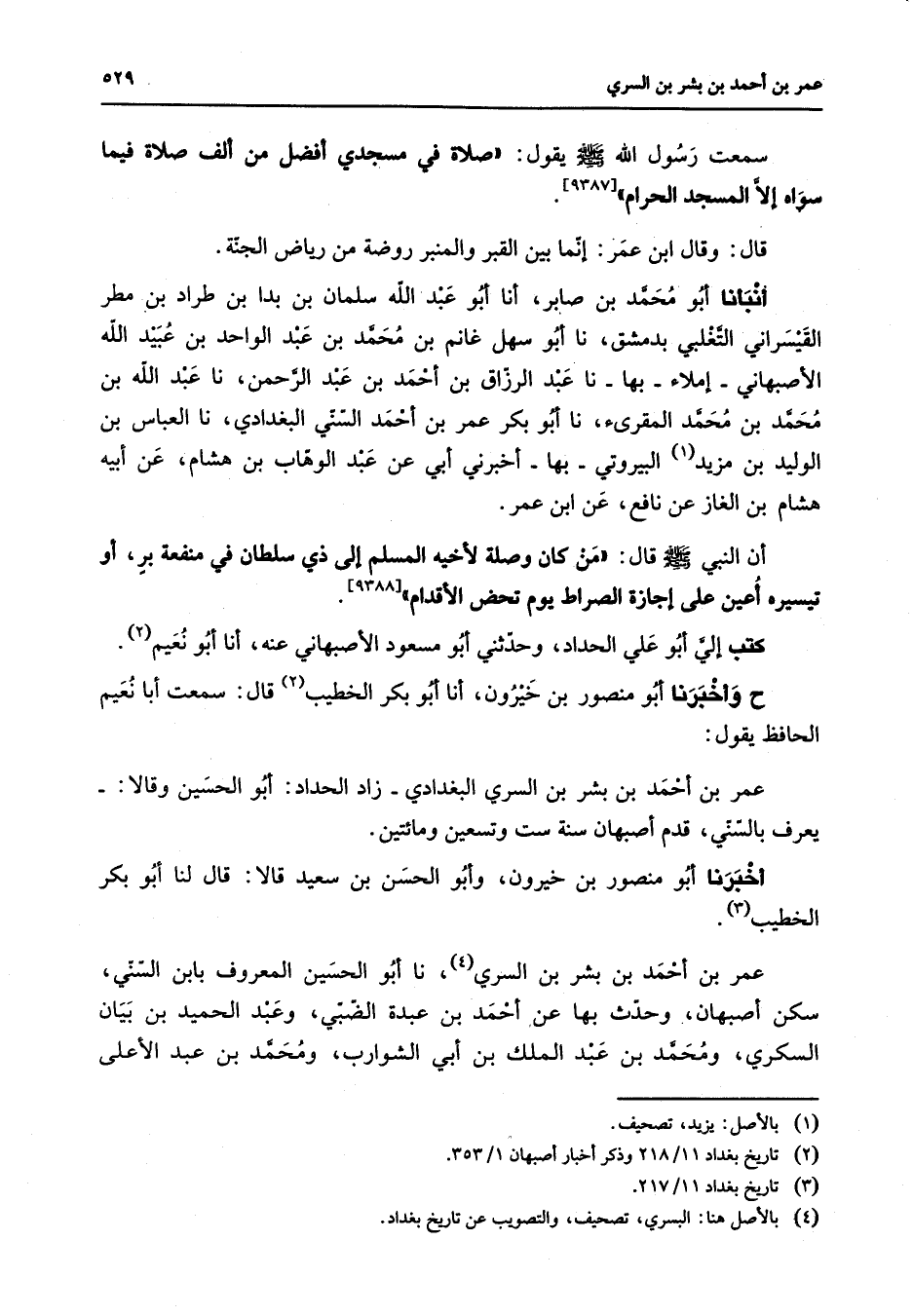 [9388] كتب إلي أبو علي الحداد وحدثني أبو مسعود الأصبهاني عنه أنا أبو نعيم (2) ح وأخبرنا أبو منصور بن خيرون أنا أبو بكر الخطيب (2) قال سمعت أبا نعيم الحافظ يقول عمر بن أحمد بن بشر بن السري البغدادي زاد الحداد أبو الحسين وقالا يعرف بالسني قدم أصبهان سنة ست وتسعين ومائتين أخبرنا أبو منصور بن خيرون وأبو الحسن بن سعيد قالا قال لنا أبو بكر الخطيب (3) عمر بن أحمد بن بشر بن السري (4) نا أبو الحسين المعروف بابن السني سكن أصبهان وحدث بها عن أحمد بن عبدة الضبي وعبد الحميد بن بيان السكري ومحمد بن عبد الملك بن أبي الشوارب ومحمد بن عبد الأعلى