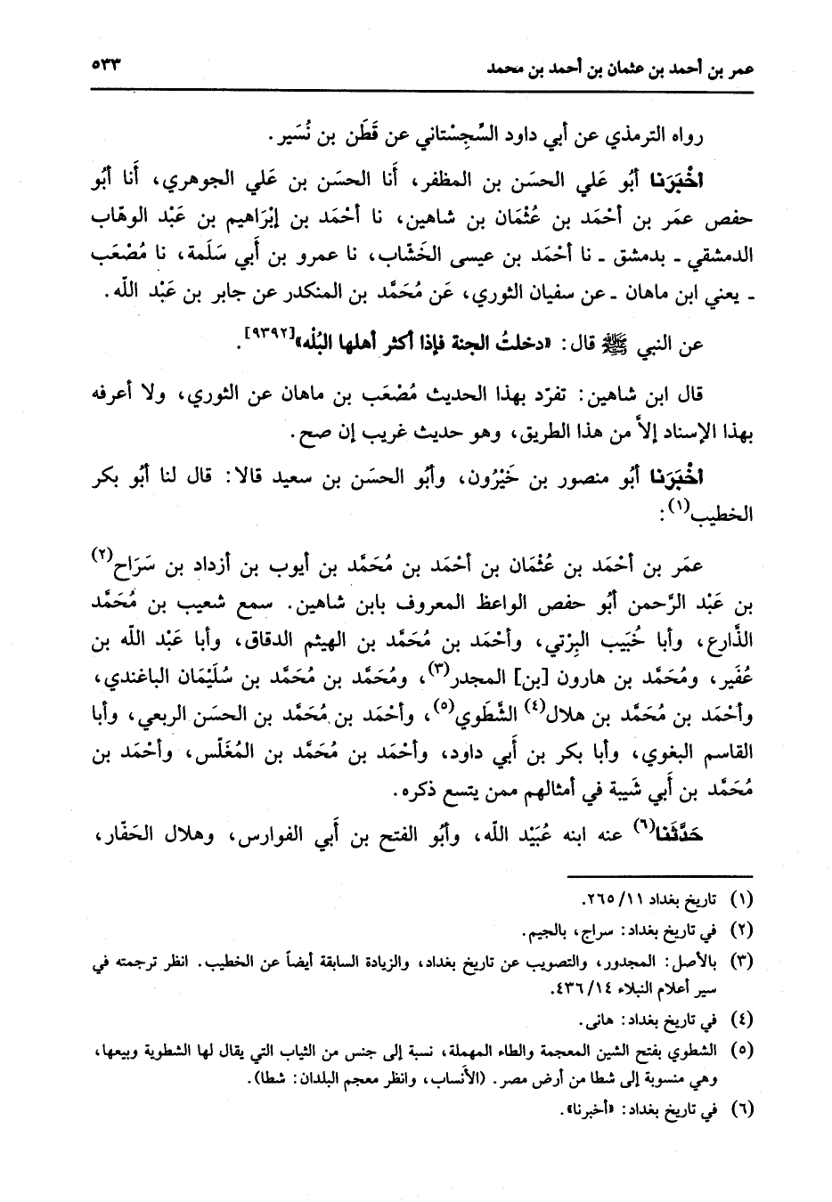 [9392] قال ابن شاهين تفرد بهذا الحديث مصعب بن ماهان عن الثوري ولا أعرفه بهذا الإسناد إلا من هذا الطريق وهو حديث غريب إن صح أخبرنا أبو منصور بن خيرون وأبو الحسن بن سعيد قالا قال لنا أبو بكر الخطيب (1) عمر بن أحمد بن عثمان بن أحمد بن محمد بن أيوب بن أزداد بن سراح (2) بن عبد الرحمن أبو حفص الواعظ المعروف بابن شاهين سمع شعيب بن محمد الذارع وأبا خبيب البرتي وأحمد بن محمد بن الهيثم الدقاق وأبا عبد الله بن عفير ومحمد بن هارون بن المجدر (3) ومحمد بن محمد بن سليمان الباغندي وأحمد بن محمد بن هلال (4) الشطوي (5) وأحمد بن محمد بن الحسن الربعي وأبا القاسم البغوي وأبا بكر بن أبي داود وأحمد بن محمد بن المغلس وأحمد بن محمد بن أبي شيبة في أمثالهم ممن يتسع ذكره حدثنا (6) عنه ابنه عبيد الله وأبو الفتح بن أبي الفوارس وهلال الحفار