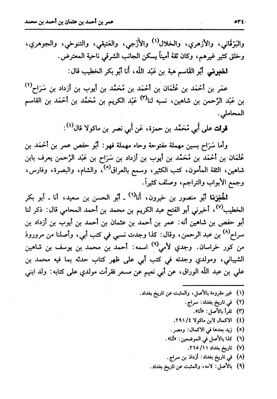 والبرقاني والأزهري والخلال (1) والأزجي والعتيقي والتنوخي والجوهري وخلق كثير غيرهم وكان ثقة أمينا يسكن الجانب الشرقي ناحية المعترض أخبرني أبو القاسم هبة بن عبد الله أنا أبو بكر الخطيب قال عمر بن أحمد بن عثمان بن أحمد بن محمد بن أيوب بن أزداد بن سراح (2) بن عبد الرحمن بن شاهين نسبه لنا (3) عبد الكريم بن محمد بن أحمد بن القاسم المحاملي قرأت على أبي محمد بن حمزة عن أبي نصر بن ماكولا قال (4) وأما سراح بسين مهملة مفتوحة وحاء مهملة فهو أبو حفص عمر بن أحمد بن عثمان بن أحمد بن محمد بن أيوب بن أزداد بن سراح بن عبد الرحمن يعرف بابن شاهين الثقة المأمون كتب الكثير وسمع بالعراق (5) والشام والبصرة وفارس وجمع الأبواب والتراجم وصنف كثيرا أخبرنا أبو منصور بن خيرون أنا (6) أبو الحسن بن سعيد أنا أبو بكر الخطيب (7) أخبرني أبو الفتح عبد الكريم بن محمد بن أحمد المحامي قال ذكر لنا أبو حفص بن شاهين أنه عمر بن أحمد بن عثمان بن أحمد بن أيوب بن أزداد بن سراح (8) بن عبد الرحمن وقال كذا وجدت نسبي في كتب أبي وأصلنا من مروروذ من كور خراسان وجدي لأمي (9) اسمه أحمد بن محمد بن يوسف بن شاهين الشيباني ومولدي وجدته في كتب أبي على ظهر كتاب حدثه بما فيه محمد بن علي بن عبد الله الوراق عن أبي نعيم عن مسعر فقرأت مولدي على كتابه ولد ابني