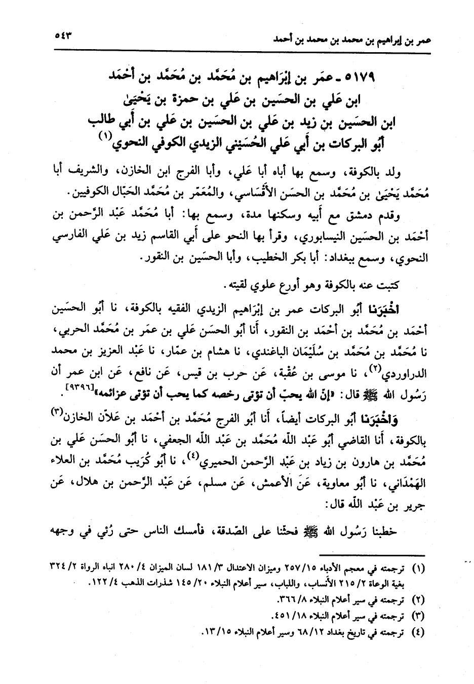 5179 - عمر بن إبراهيم بن محمد بن محمد بن أحمد بن علي بن الحسين بن علي بن حمزة بن يحيى بن الحسين بن زيد بن علي بن الحسين بن علي بن أبي طالب أبو البركات بن أبي علي الحسيني الزيدي الكوفي النحوي (1) ولد بالكوفة وسمع بها أباه أبا علي وأبا الفرج ابن الخازن والشريف أبا محمد يحيى بن محمد بن الحسن الأقساسي والمعمر بن محمد الحبال الكوفيين وقدم دمشق مع أبيه وسكنها مدة وسمع بها أبا محمد عبد الرحمن بن أحمد بن الحسين النيسابوري وقرأ بها النحو على أبي القاسم زيد بن علي الفارسي النحوي وسمع ببغداد أبا بكر الخطيب وأبا الحسين بن النقور كتبت عنه بالكوفة وهو أورع علوي لقيته أخبرنا أبو البركات عمر بن إبراهيم الزيدي الفقيه بالكوفة نا أبو الحسين أحمد بن محمد بن أحمد بن النقور أنا أبو الحسن علي بن عمر بن محمد الحربي نا محمد بن محمد بن سليمان الباغندي نا هشام بن عمار نا عبد العزيز بن محمد الدراوردي (2) نا موسى بن عقبة عن حرب بن قيس عن نافع عن ابن عمر أن رسول الله (صلى الله عليه وسلم) قال إن الله يحب أن تؤتى رخصه كما يحب أن تؤتى عزائمه