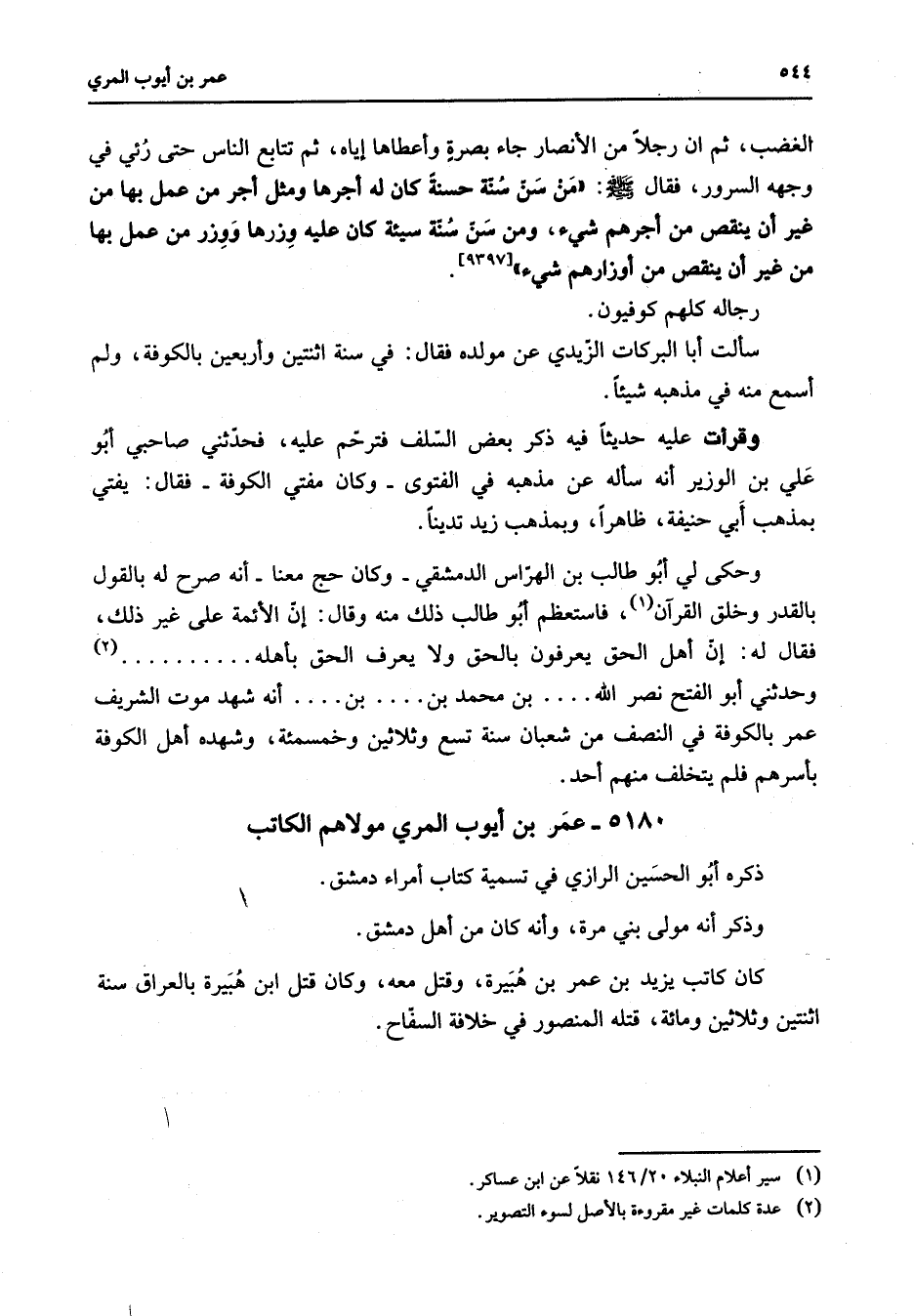 5180 - عمر بن أيوب المري مولاهم الكاتب ذكره أبو الحسين الرازي في تسمية كتاب أمراء دمشق وذكر أنه مولى بني مرة وأنه كان من أهل دمشق كان كاتب يزيد بن عمر بن هبيرة وقتل معه وكان قتل ابن هبيرة بالعراق سنة اثنتين وثلاثين ومائة قتله المنصور في خلافة السفاح