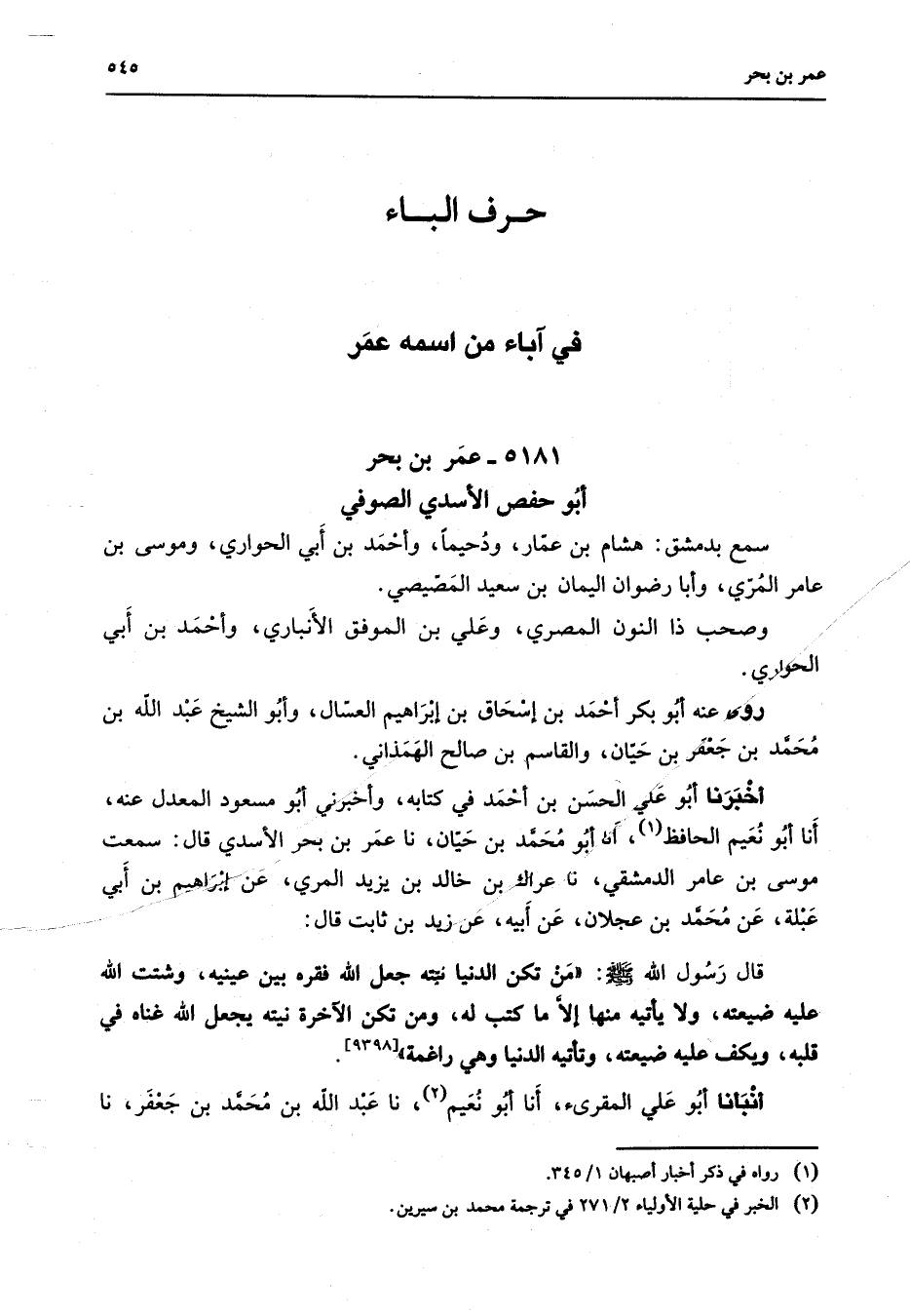 5181 - عمر بن بحر أبو حفص الأسدي الصوفي سمع بدمشق هشام بن عمار ودحيما وأحمد بن أبي الحواري وموسى بن عامر المري وأبا رضوان اليمان بن سعيد المصيصي وصحب ذا النون المصري وعلي بن الموفق الأنباري وأحمد بن أبي الحواري روى عنه أبو بكر أحمد بن إسحاق بن إبراهيم العسال وأبو الشيخ عبد الله بن محمد بن جعفر بن حيان والقاسم بن صالح الهمذاني أخبرنا أبو علي الحسن بن أحمد في كتابه وأخبرني أبو مسعود المعدل عنه أنا أبو نعيم الحافظ (1) أنا أبو محمد بن حيان نا عمر بن بحر الأسدي قال سمعت موسى بن عامر الدمشقي نا عراك بن خالد بن يزيد المري عن إبراهيم بن أبي عبلة عن محمد بن عجلان عن أبيه عن زيد بن ثابت قال قال رسول الله (صلى الله عليه وسلم) من تكن الدنيا نيته جعل الله فقره بين عينيه وشتت الله عليه ضيعته ولا يأتيه منها إلا ما كتب له ومن تكن الآخرة نيته يجعل الله غناه في قلبه ويكف عليه ضيعته وتأتيه الدنيا وهي راغمة