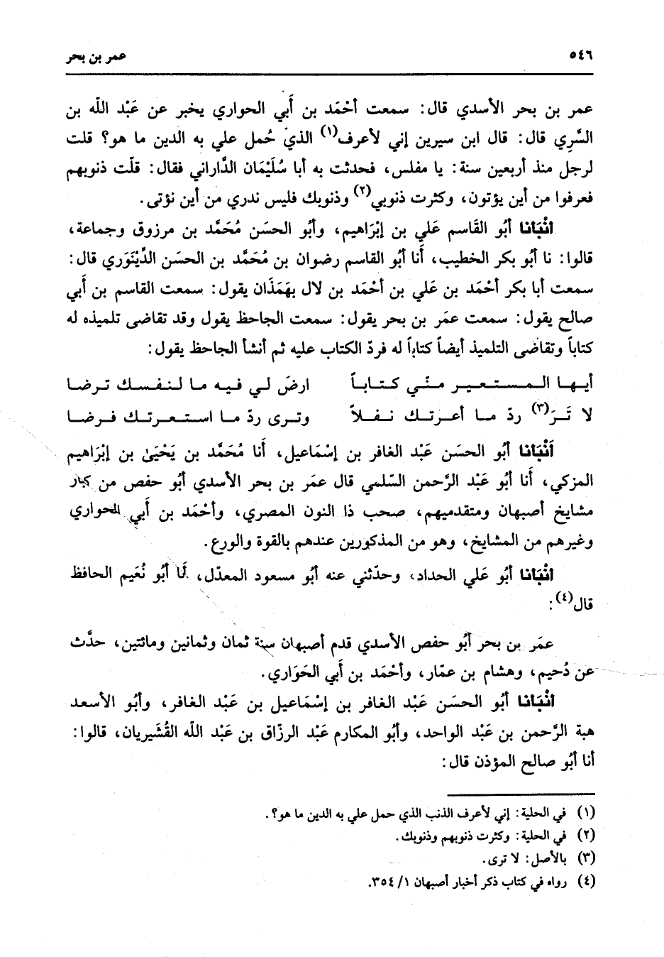 عمر بن بحر الأسدي قال سمعت أحمد بن أبي الحواري يخبر عن عبد الله بن السري قال قال ابن سيرين إني لأعرف (1) الذي حمل علي به الدين ما هو قلت لرجل منذ أربعين سنة يا مفلس فحدثت به أبا سليمان الداراني فقال قلت ذنوبهم فعرفوا من أين يؤتون وكثرت ذنوبي (2) وذنوبك فليس ندري من أين نؤتى أنبأنا أبو القاسم علي بن إبراهيم وأبو الحسن محمد بن مرزوق وجماعة قالوا نا أبو بكر الخطيب أنا أبو القاسم رضوان بن محمد بن الحسن الدينوري قال سمعت أبا بكر أحمد بن علي بن أحمد بن لال بهمذان يقول سمعت القاسم بن أبي صالح يقول سمعت عمر بن بحر يقول سمعت الجاحظ يقول وقد تقاضى تلميذه له كتابا وتقاضي التلميذ أيضا كتابا له فرد الكتاب عليه ثم أنشأ الجاحظ يقول * أيها المستعير مني كتابا * ارض لي فيه ما لنفسك ترضا لا تر (3) رد ما أعرتك نفلا * وترى رد ما استعرتك فرضا * أنبأنا أبو الحسن عبد الغافر بن إسماعيل أنا محمد بن يحيى بن إبراهيم المزكي أنا أبو عبد الرحمن السلمي قال عمر بن بحر الأسدي أبو حفص من كبار مشايخ أصبهان ومتقدميهم صحب ذا النون المصري وأحمد بن أبي الحواري وغيرهم من المشايخ وهو من المذكورين عندهم بالقوة والورع أنبأنا أبو علي الحداد وحدثني عنه أبو مسعود المعدل أنا أبو نعيم الحافظ قال (4) عمر بن بحر أبو حفص الأسدي قدم أصبهان سنة ثمان وثمانين ومائتين حدث عن دحيم وهشام بن عمار وأحمد بن أبي الحواري أنبأنا أبو الحسن عبد الغافر بن إسماعيل بن عبد الغافر وأبو الأسعد هبة الرحمن بن عبد الواحد وأبو المكارم عبد الرزاق بن عبد الله القشيريان قالوا أنا أبو صالح المؤذن قال