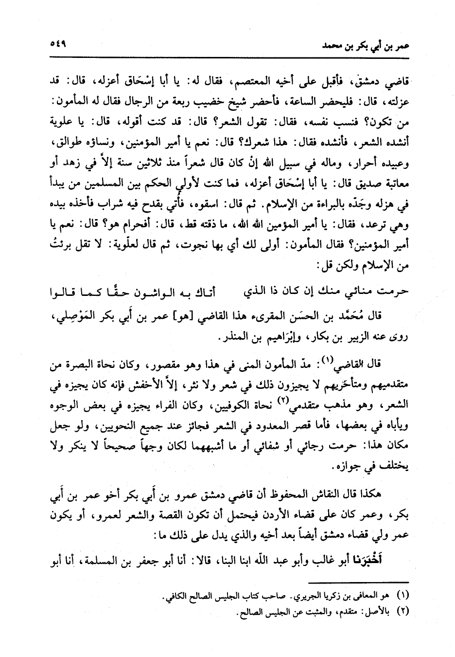 قاضي دمشق فأقبل على أخيه المعتصم فقال له يا أبا إسحاق أعزله قال قد عزلته قال فليحضر الساعة فأحضر شيخ خضيب ربعة من الرجال فقال له المأمون من تكون فنسب نفسه فقال تقول الشعر قال قد كنت أقوله قال يا علوية أنشده الشعر فأنشده فقال هذا شعرك قال نعم يا أمير المؤمنين ونساؤه طوالق وعبيده أحرار وماله في سبيل الله إن كان قال شعرا منذ ثلاثين سنة إلا في زهد أو معاتبة صديق قال يا أبا إسحاق أعزله فما كنت لأولي الحكم بين المسلمين من يبدأ في هزله وجده بالبراءة من الإسلام ثم قال اسقوه فأتي بقدح فيه شراب فأخذه بيده وهي ترعد فقال يا أمير المؤمنين الله الله ما ذقته قط قال أفحرام هو قال نعم يا أمير المؤمنين فقال المأمون أولى لك أي بها نجوت ثم قال لعلوية لا تقل برئت من الإسلام ولكن قل * حرمت منائي منك إن كان ذا الذي * أتاك به الواشون حقا كما قالوا * قال محمد بن الحسن المقرئ هذا القاضي هو عمر بن أبي بكر الموصلي روى عنه الزبير بن بكار وإبراهيم بن المنذر قال القاضي (1) مد المأمون المنى في هذا وهو مقصور وكان نحاة البصرة من متقدميهم ومتأخريهم لا يجيزون ذلك في شعر ولا نثر إلا الأخفش فإنه كان يجيزه في الشعر وهو مذهب متقدمي (2) نحاة الكوفيين وكان الفراء يجيزه في بعض الوجوه ويأباه في بعضها فأما قصر المعدود في الشعر فجائز عند جميع النحويين ولو جعل مكان هذا حرمت رجائي أو شفائي أو ما أشبههما لكان وجها صحيحا لا ينكر ولا يختلف في جوازه هكذا قال النقاش المحفوظ أن قاضي دمشق عمرو بن أبي بكر أخو عمر بن أبي بكر وعمر كان على قضاء الأردن فيحتمل أن تكون القصة والشعر لعمرو أو يكون عمر ولي قضاء دمشق أيضا بعد أخيه والذي يدل على ذلك ما أخبرنا أبو غالب وأبو عبد الله ابنا البنا قالا أنا أبو جعفر بن المسلمة أنا أبو