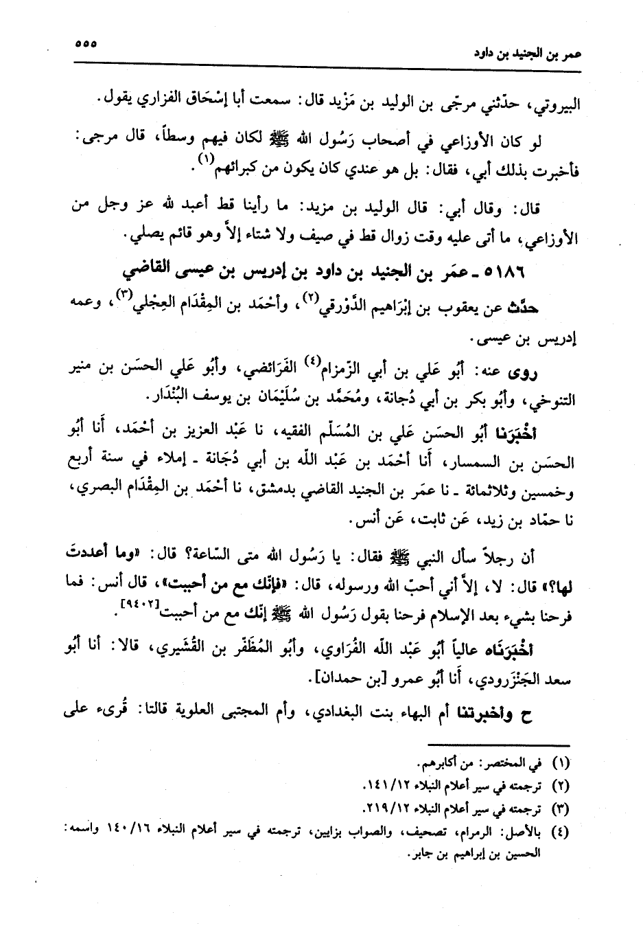 5186 - عمر بن الجنيد بن داود بن إدريس بن عيسى القاضي حدث عن يعقوب بن إبراهيم الدورقي (2) وأحمد بن المقدام العجلي (3) وعمه إدريس بن عيسى روى عنه أبو علي بن أبي الزمزام (4) الفرائضي وأبو علي الحسن بن منير التنوخي وأبو بكر بن أبي دجانة ومحمد بن سليمان بن يوسف البندار أخبرنا أبو الحسن علي بن المسلم الفقيه نا عبد العزيز بن أحمد أنا أبو الحسن بن السمسار أنا أحمد بن عبد الله بن أبي دجانة إملاء في سنة أربع وخمسين وثلاثمائة نا عمر بن الجنيد القاضي بدمشق نا أحمد بن المقدام البصري نا حماد بن زيد عن ثابت عن أنس أن رجلا سأل النبي (صلى الله عليه وسلم) فقال يا رسول الله متى الساعة قال وما أعددت لها قال لا إلا أني أحب الله ورسوله قال فإنك مع من أحببت قال أنس فما فرحنا بشئ بعد الإسلام فرحنا بقول رسول الله (صلى الله عليه وسلم) إنك مع من أحببت