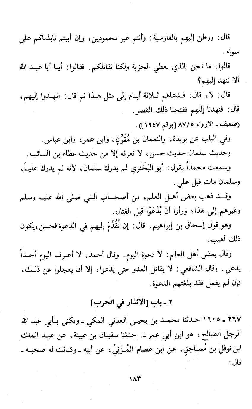 2 - باب (الانذار في الحرب) 267 - 1605 حدثنا محمد بن يحيى العدني المكي - ويكنى بأبي عبد الله الرجل الصالح، هو ابن أبي عمر -.
