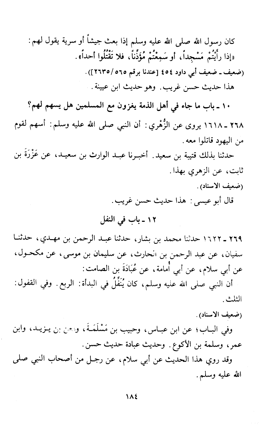 12 - باب في النفل 269 - 1622 حدثنا محمد بن بشار، حدثنا عبد الرحمن بن مهدي، حدثنا سفيان، عن عبد الرحمن بن الحارث، عن سليمان بن موسى، عن مكحول، عن أبي سلام، عن أبي أمامة، عن عبادة بن الصامت: أن النبي صلى الله عليه وسلم، كان ينفل في البدأة: الربع.