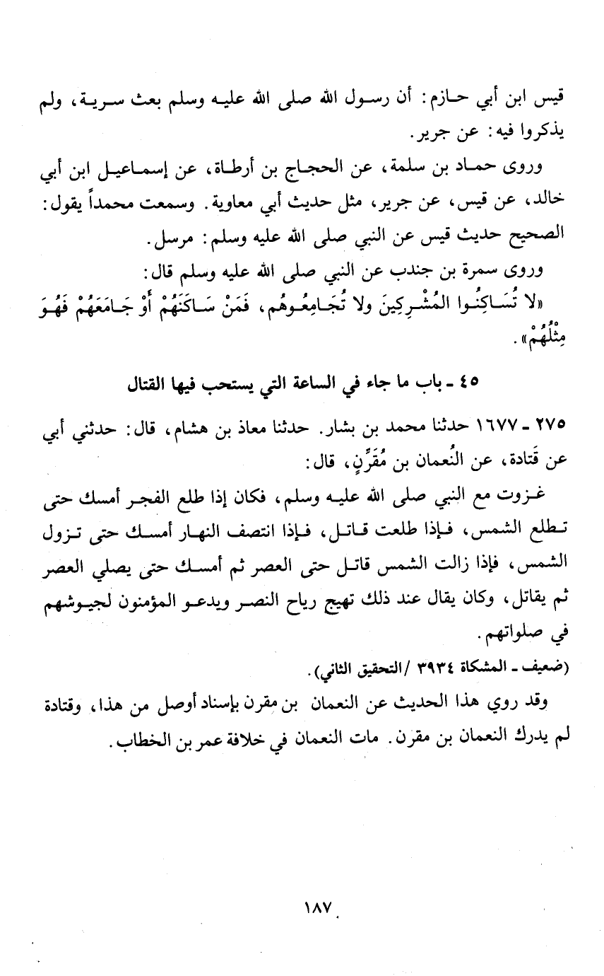 45 - باب ما جاء في الساعة التي يستحب فيها القتال 275 - 1677 حدثنا محمد بن بشار.
