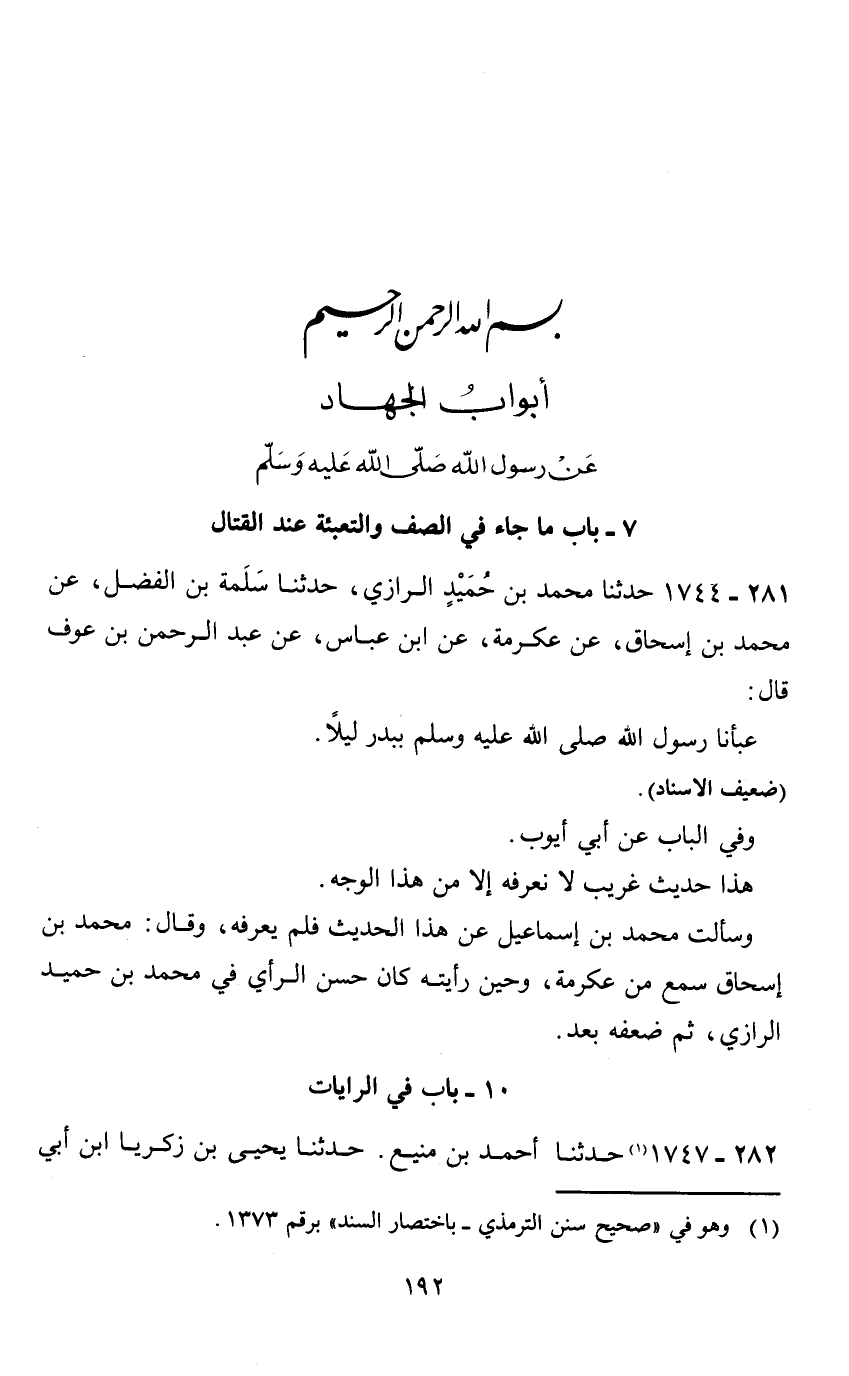 بسم الله الرحمن الرحيم أبواب الجهاد عن رسول الله صلى الله عليه وسلم 7 - باب ما جاء في الصف والتعبئة عند القتال 281 - 1744 حدثنا محمد بن حميد الرازي، حدثنا سلمة بن الفضل، عن محمد بن إسحاق، عن عكرمة، عن ابن عباس، عن عبد الرحمن بن عوف قال: عبأنا رسول الله صلى الله عليه وسلم ببدر ليلا.