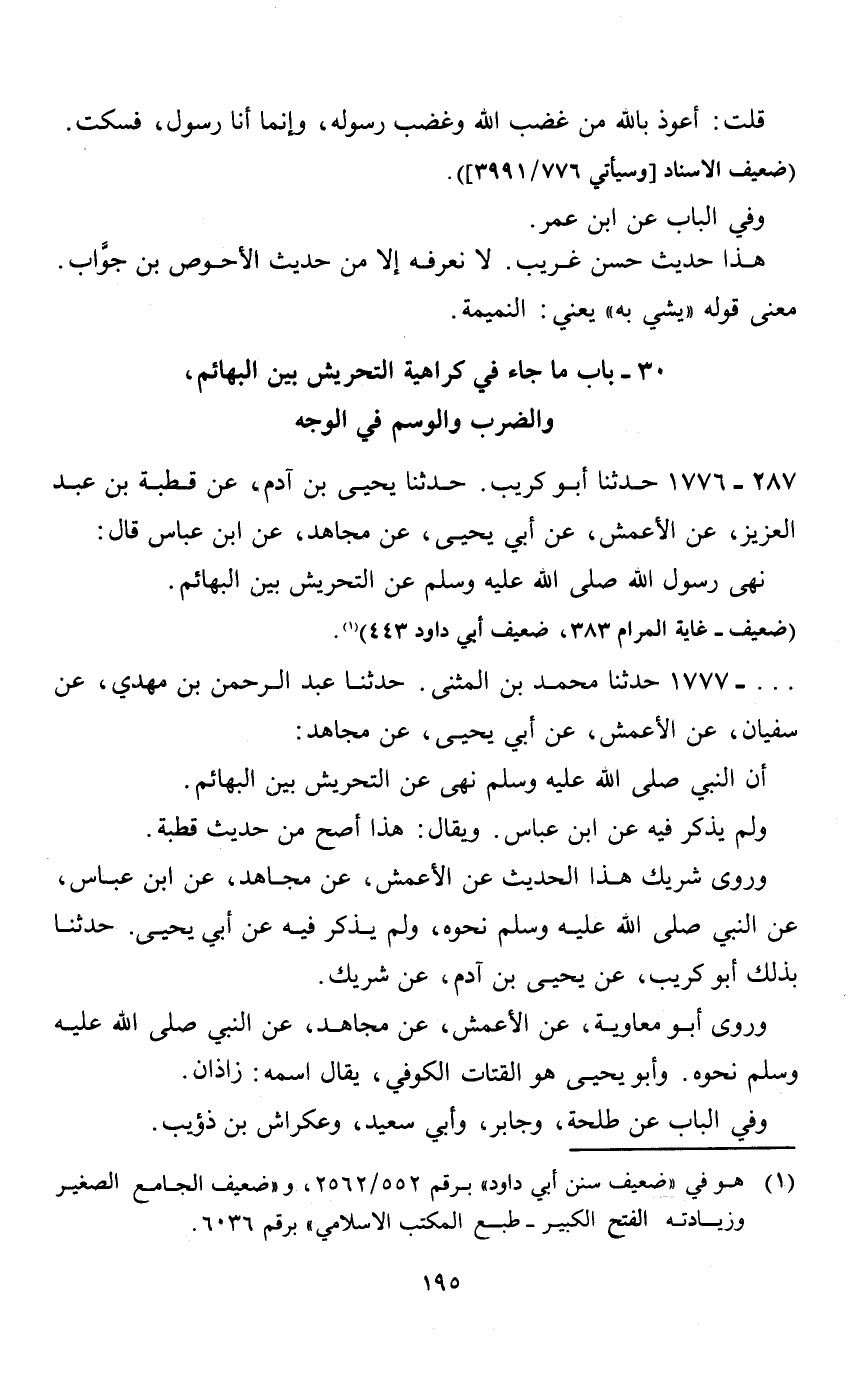 30 - باب ما جاء في كراهية التحريش بين البهائم، والضرب والوسم في الوجه 287 - 1776 حدثنا أبو كريب.