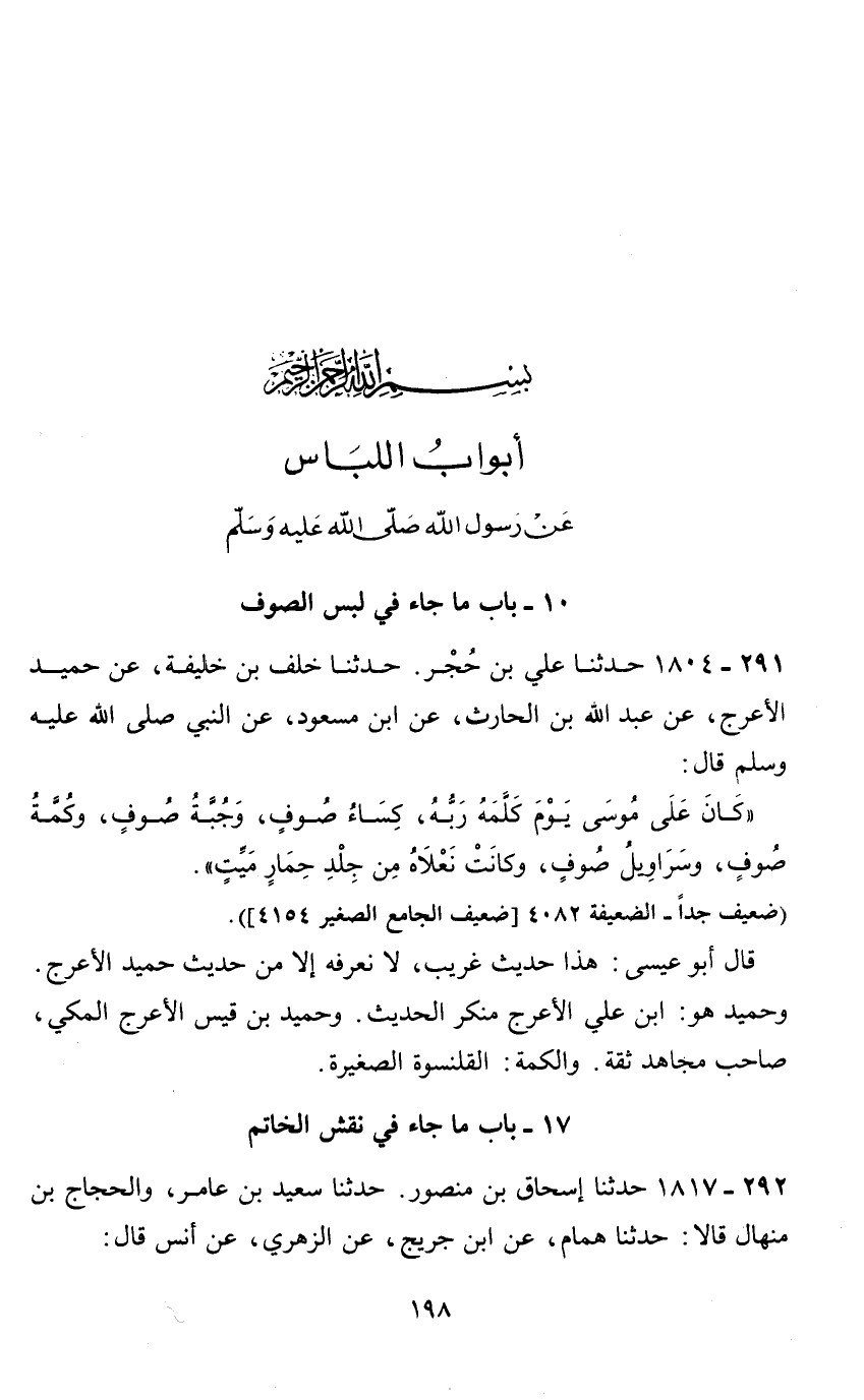 بسم الله الرحمن الرحيم أبواب اللباس عن رسول الله صلى الله عليه وسلم، 10 - باب ما جاء في لبس الصوف 291 - 1804 حدثنا علي بن حجر.