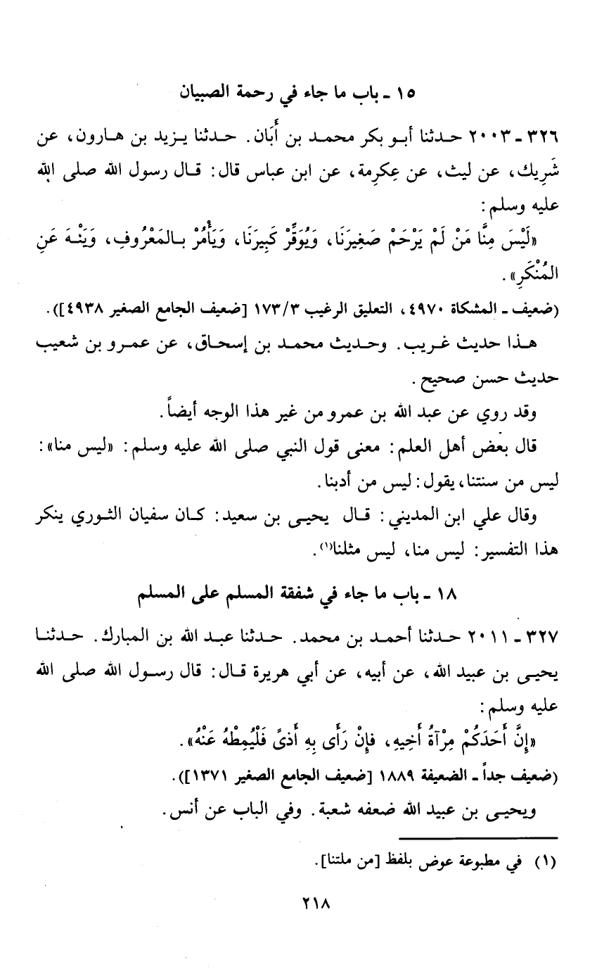 15 - باب ما جاء في رحمة الصبيان 326 - 2003 حدئنا أبو بكر محمد بن أبان.