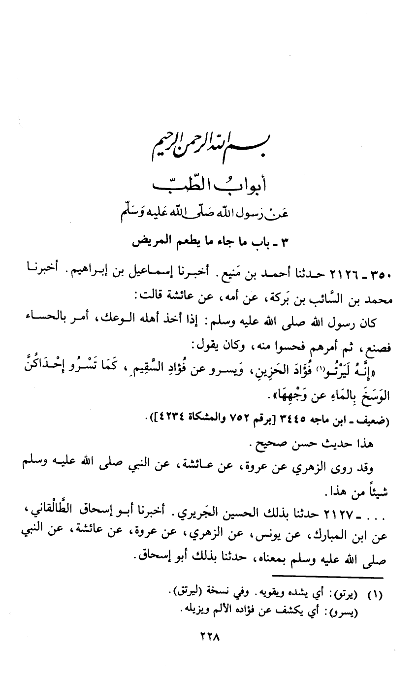 بسم الله الرحمن الرحيم أبواب الطب عن رسول الله صلى الله عليه وسلم 3 - باب ما جاء ما يطعم المريض 350 - 2126 حدثنا أحمد بن منيع.