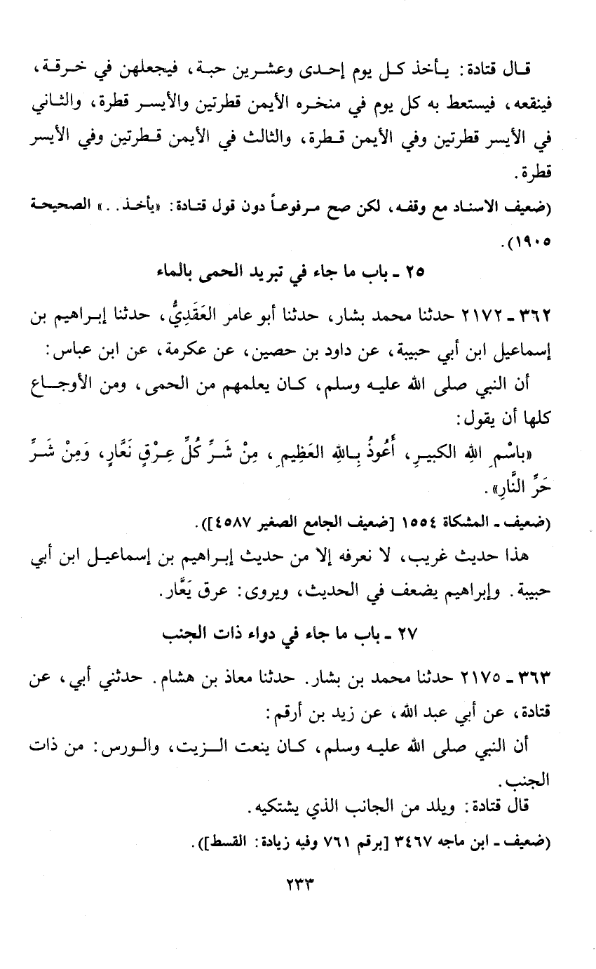 25 - باب ما جاء في تبريد الحمى بالماء 362 - 2172 حدثنا محمد بشار، حدثنا أبو عامر العقدي، حدثنا إبراهيم بن إسماعيل ابن أبي حبيبة، عن داود بن حصين، عن عكرمة، عن ابن عباس: أن النبي صلى الله عليه وسلم، كان يعلمهم من الحمى، ومن الاوجاع كلها أن يقول: " باسم الله الكبير، أعوذ بالله العظيم، من شر كل عرق نعار، ومن شر حر النار ".