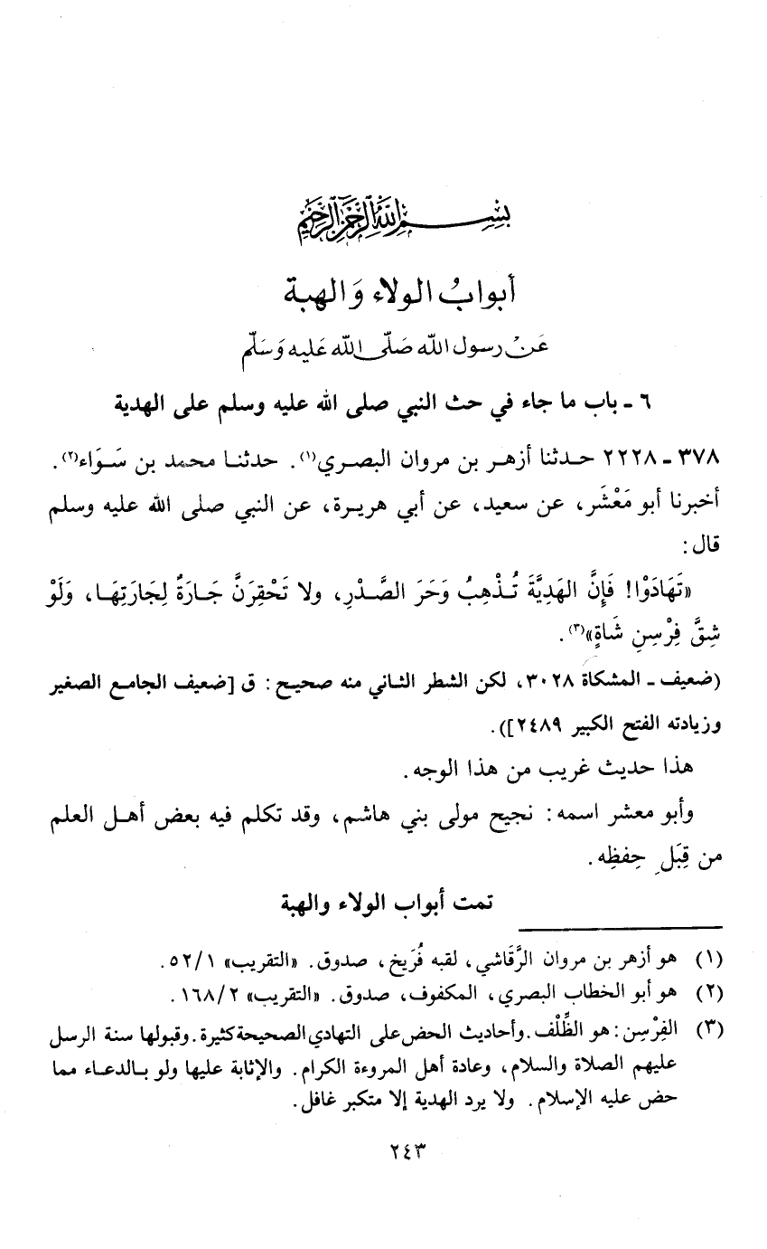 بسم الله الرحمن الرحيم أبواب الولاء والهبة عن رسول الله صلى الله عليه وسلم 6 - باب ما جاء في حث النبي صلى الله عليه وسلم على الهدية 378 - 2228 حدثنا أزهر بن مروان البصري (1) .