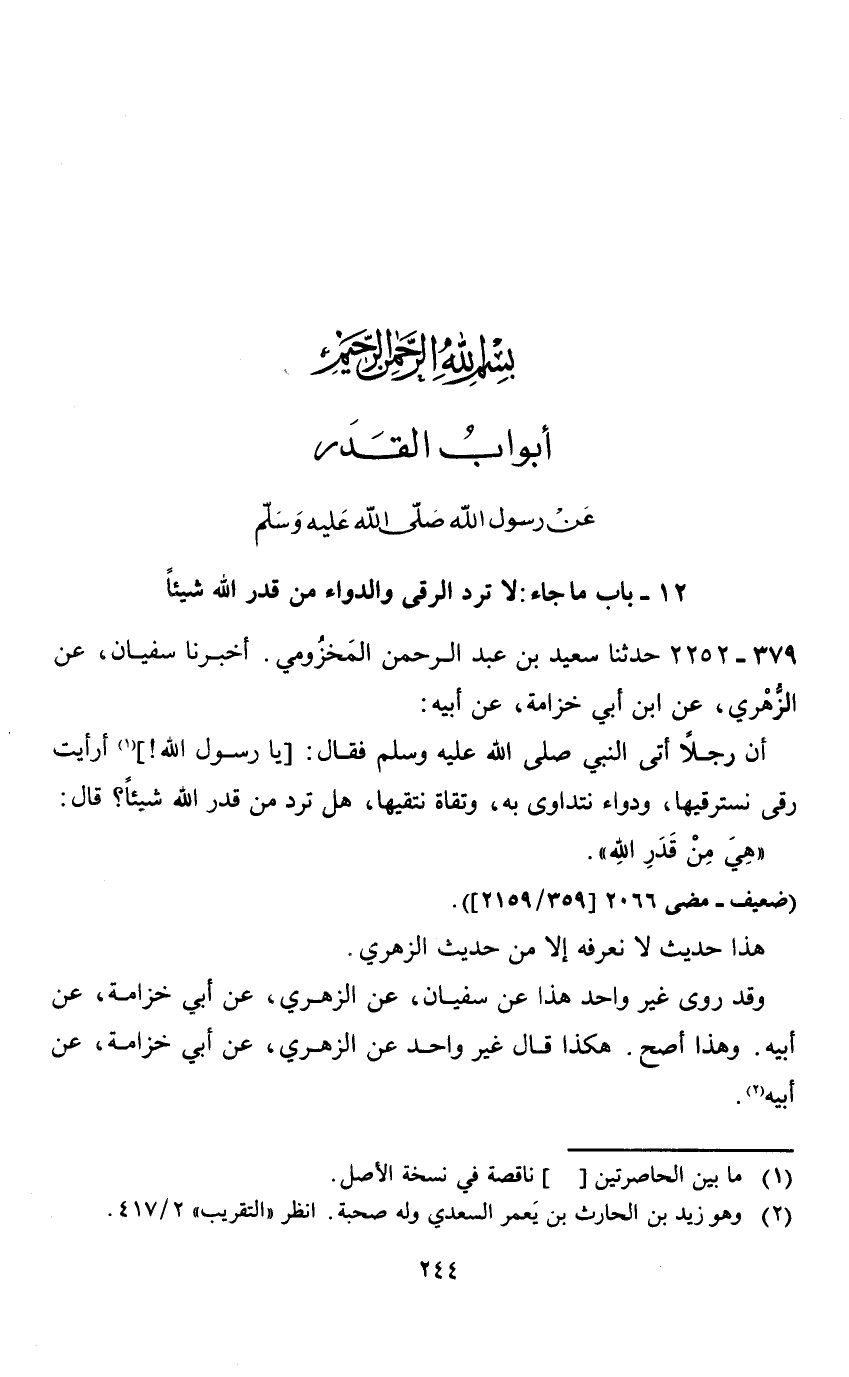أبواب القدر عن رسول الله صلى الله عليه وسلم 12 - باب ما جاء: لا ترد الرقى والدواء من قدر الله شيئا 379 - 2252 حدثنا سعيد بن عبد الرحمن المخزومي.