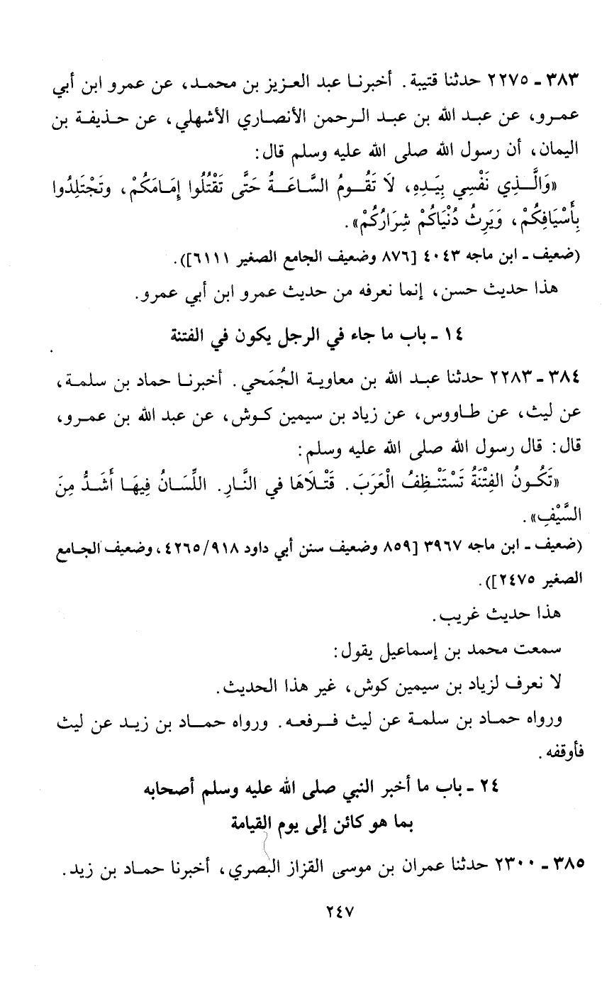 24 - باب ما أخبر النبي صلى الله عليه وسلم أصحابه بما هو كائن إلى يوم القيامة 385 - 2300 حدثنا عمران بن موسى القزاز البصري، أخبرنا حماد بن زيد.