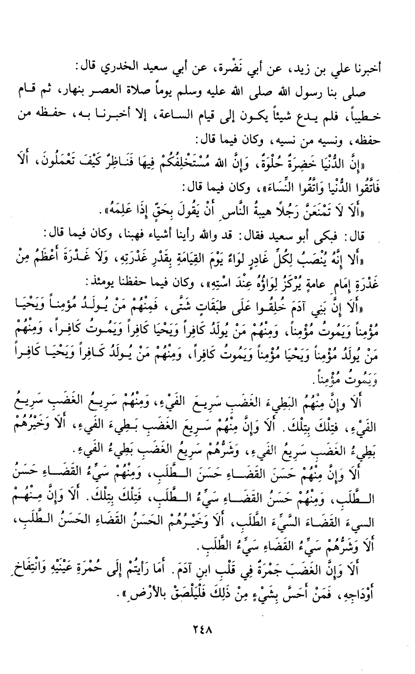 قال: فبكى أبو سعيد فقال: قد والله رأينا أشياء فهبنا، وكان فيما قال: (ألا إنه ينصب لكل غادر لواء يوم القيامة بقدر غدرته، ولا غدرة أعظم من غدرة إمام عامة يركز لواؤه عند استه "، وكان فيما حفظنا يومئذ: " ألا إن بني آدم خلقوا على طبقات شتى، فمنهم من يولد مؤمنا ويحيا مؤمنا ويموت مؤمنا، ومنهم من يولد كافرا ويحيا كافرا ويموت كافرا، ومنهم من يولد مؤمنا ويحيا مؤمنا ويموت كافرا، ومنهم من يولد كافرا ويحيا كافرا ويموت مؤمنا.