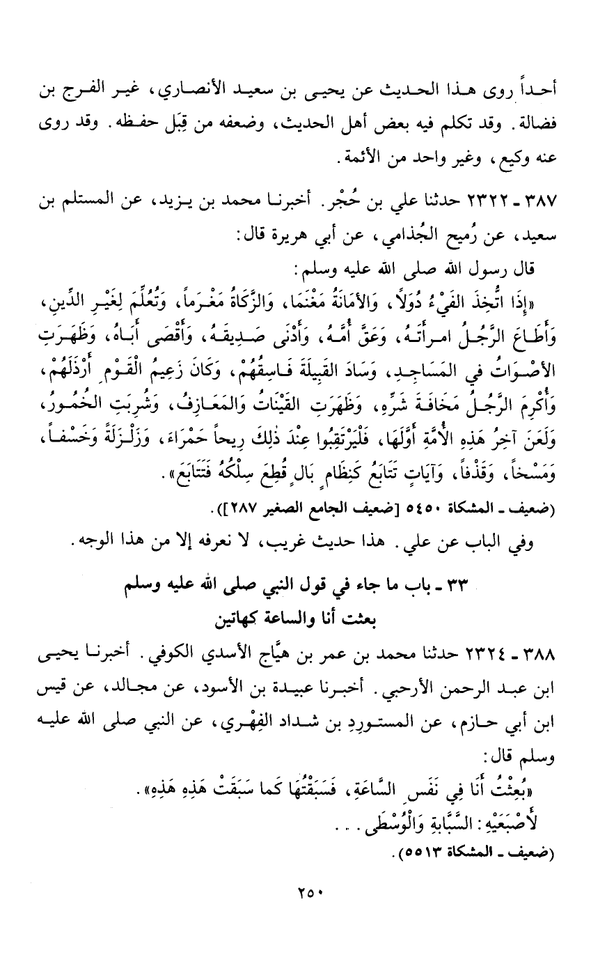 33 - باب ما جاء في قول النبي صلى الله عليه وسلم بعثت أنا والساعة كهاتين 388 - 2324 حدثنا محمد بن عمر بن هياج الاسدي الكوفي.