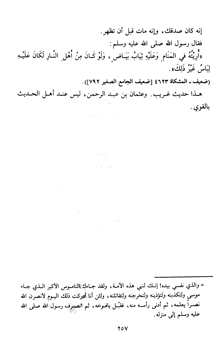 فقال رسول الله صلى الله عليه وسلم: " أريته في المنام وعليه ثياب بياض، ولو كان من أهل النار لكان عليه لباس غير ذلك ".