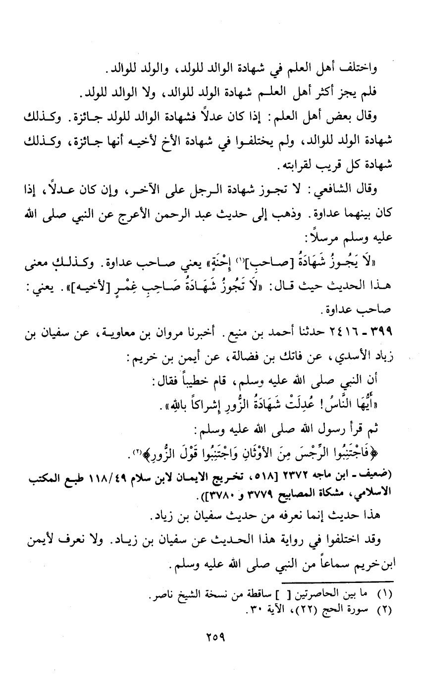 ثم قرأ رسول الله صلى الله عليه وسلم: (فاجتنبوا الرجس من الاوثان واجتنبوا قول الزور) (2) .