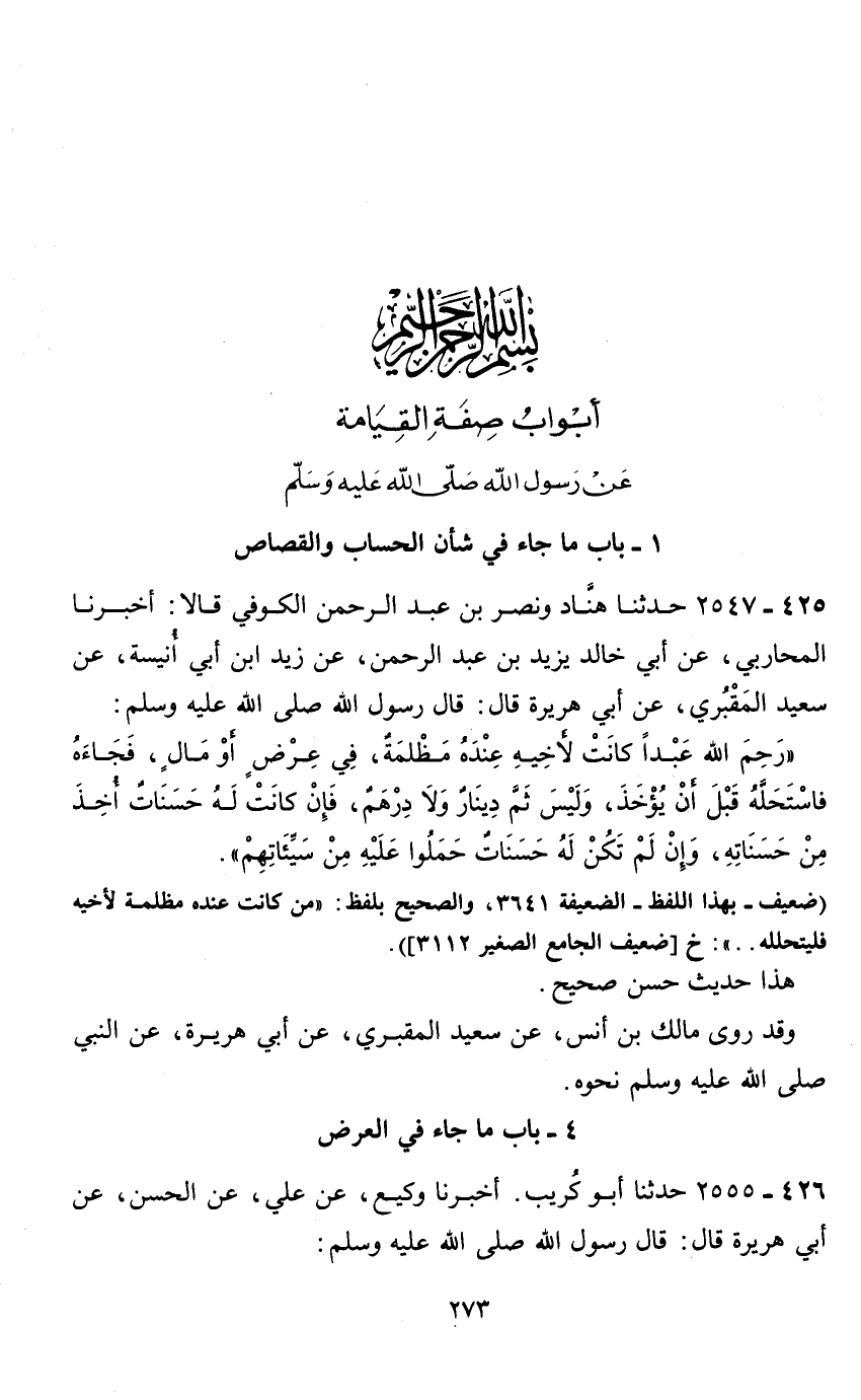 بسم الله الرحمن الرحيم أبواب صفة القيامة عن رسول الله صلى الله عليه وسلم 1 - باب ما جاء في شأن الحساب والقصاص 425 - 2547 حدثنا هناد ونصر بن عبد الرحمن الكوفي قالا: أخبرنا المحاربي، عن أبي خالد يزيد بن عبد الرحمن، عن زيد ابن أبي أنيسة، عن سعيد المقبري، عن أبي هريرة قال: قال رسول الله صلى الله عليه وسلم: " رحم الله عبدا كانت لاخيه عنده مظلمة، في عرض أو مال، فجاءه