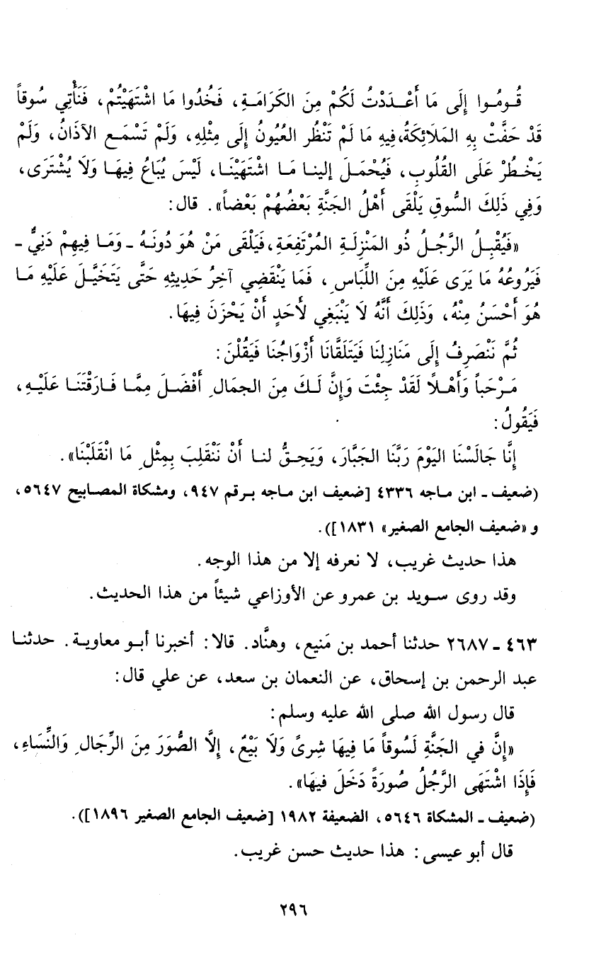 حدثنا عبد الرحمن بن إسحاق، عن النعمان بن سعد، عن علي قال: قال رسول الله صلى الله عليه وسلم: " إن في الجنة لسوقا ما فيها شرى ولا بيع، إلا الصور من الرجال والنساء، فإذا اشتهى الرجل صورة دخل فيها ".