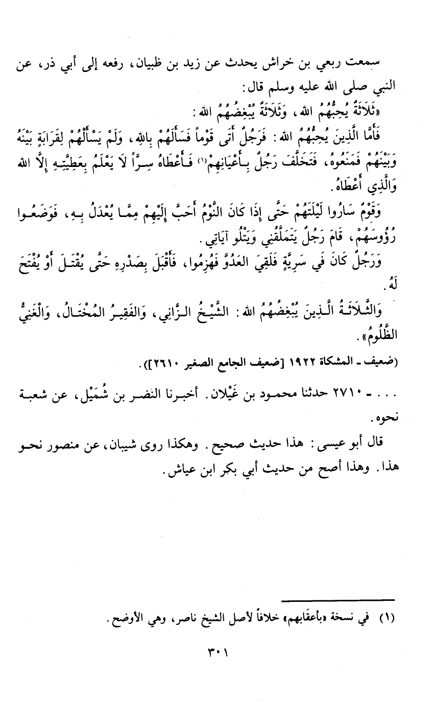 سمعت ربعي بن خراش يحدث عن زيد بن ظبيان، رفعه إلى أبي ذر، عن النبي صلى الله عليه وسلم قال: " ثلاثة يحبهم الله، وثلاثة يبغضهم الله: فأما الذين يحبهم الله: فرجل أتى قوما فسألهم بالله، ولم يسألهم لقرابة بينه وبينهم فمنعوه، فتخلف رجل بأعيانهم (1) فأعطاه سرا لا يعلم بعطيته إلا الله والذي أعطاه.