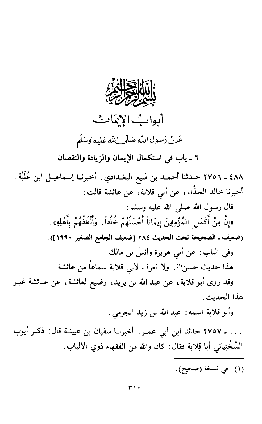 بسم الله الرحمن الرحيم أبواب الايمان عن رسول الله صلى الله عليه وسلم 6 - باب في استكمال الايمان والزيادة والنقصان 488 - 2756 حدثنا أحمد بن منيع البغدادي.