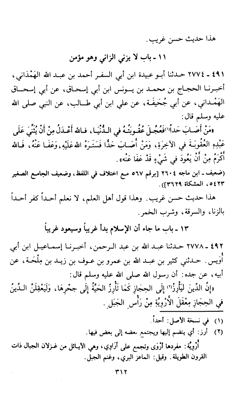 11 - باب لا يزني الزاني وهو مؤمن 491 - 2774 حدثنا أبو عبيدة ابن أبي السفر أحمد بن عبد الله الهمداني، أخبرنا الحجاج بن محمد بن يونس ابن أبي إسحاق، عن أبي إسحاق الهمداني، عن أبي جحيفة، عن علي ابن أبي طالب، عن النبي صلى الله عليه وسلم قال: " من أصاب حدا (1) فعجل عقوبته في الدنيا، فالله أعدل من أن يثني على عبده العقوبة في الاخرة، ومن أصاب حدا فستره الله عليه، وعفا عنه، فالله أكرم من أن يعود في شئ قد عفا عنه ".
