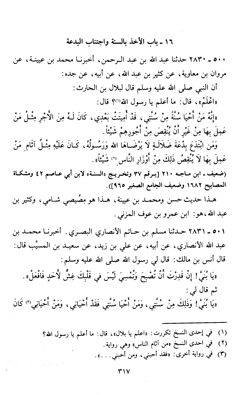 16 - باب الاخذ بالسنة واجتناب البدعة 500 - 2830 حدثنا عبد الله بن عبد الرحمن، أخبرنا محمد بن عيينة، عن مروان بن معاوية، عن كثير بن عبد الله، عن أبيه، عن جده: أن النبي صلى الله عليه وسلم قال لبلال بن الحارث: " اعلم "، قال: ما أعلم يا رسول الله (1) ؟ قال: