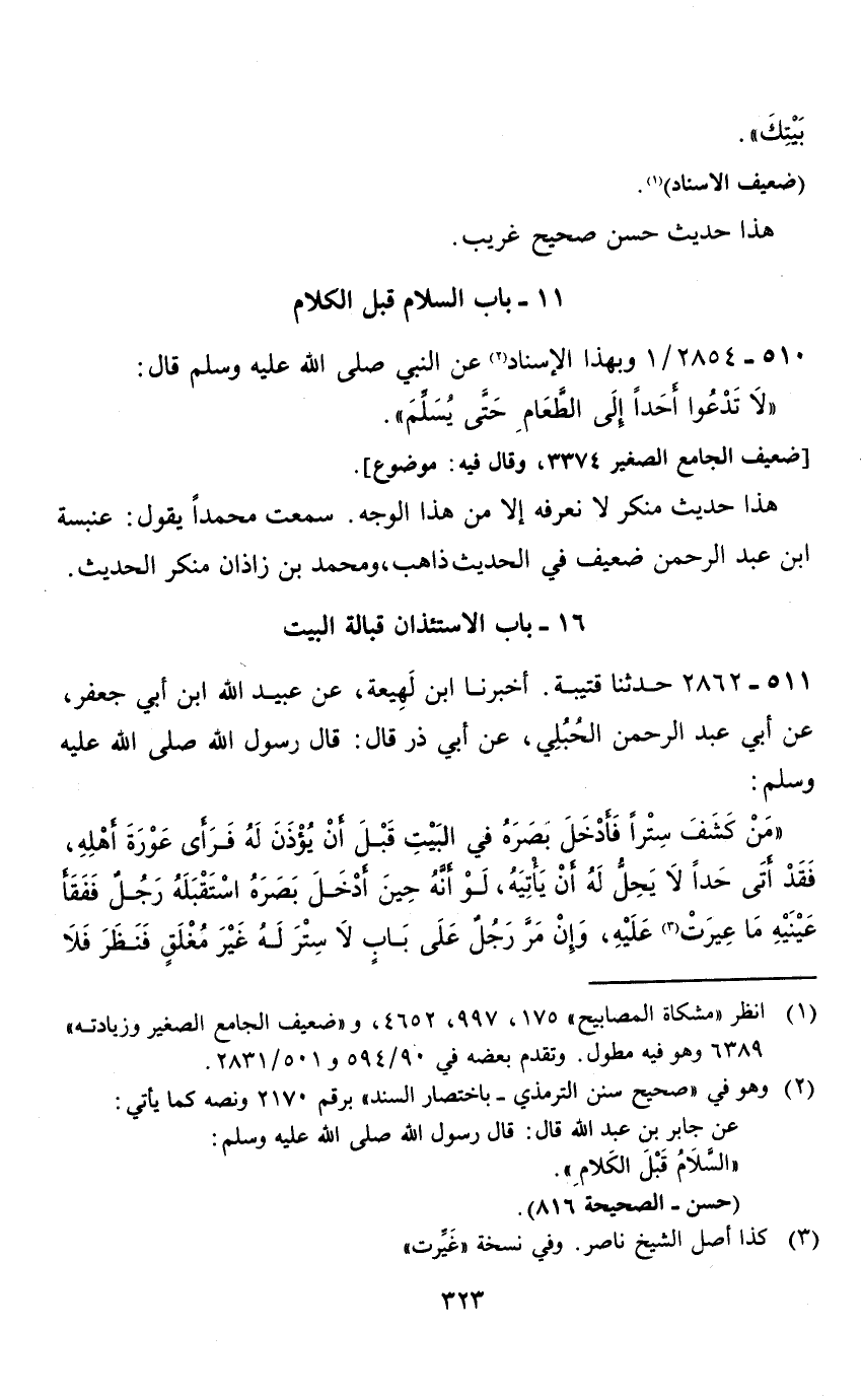 (2) وهو في " صحيح سنن الترمذي - باختصار السند " برقم 2170 ونصه كما يأتي: عن جابر بن عبد الله قال: قال رسول الله صلى الله عليه وسلم: " السلام قبل الكلام ".